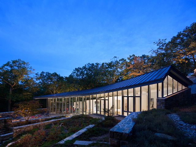 The McCann Residence defines a serpentine approach with an ascending sequence of retaining walls, mined from a nearby quarry. Three enclosed living levels and a series of outdoor terraces climb up the steep site bordered by two massive granite escarpments. The upper garden level—a loft-like glass pavilion—reveals a panoramic vista of Tuxedo Lake and the Ramapo Mountains.