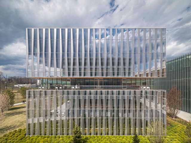 Activated by a restaurant on the ground floor, the 140,000-square-foot Novartis Oncology Building includes five floors of open office work areas connected by an ascending spiral of "living rooms" with continuous vistas to the generous 230-acre campus.