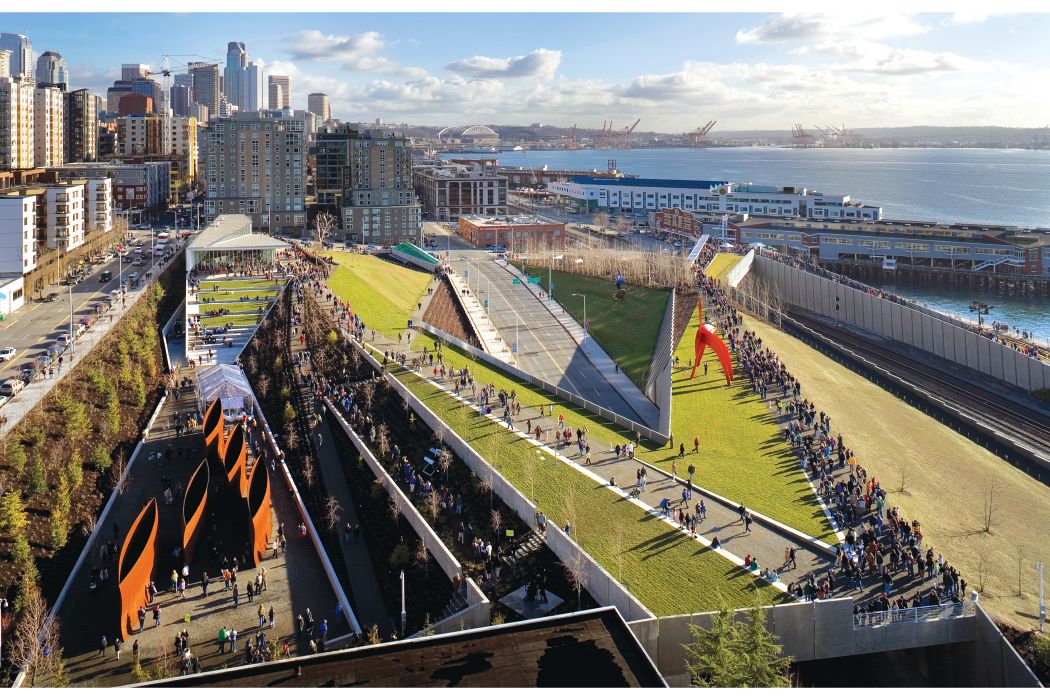 A continuous constructed landscape for art, the uninterrupted Z-shaped "green" platform rises over the existing infrastructure to reconnect the urban core to the revitalized Seattle waterfront.