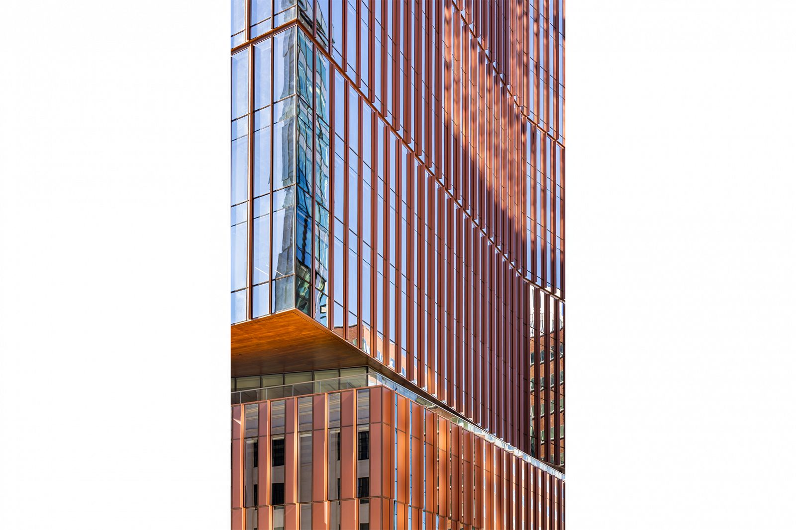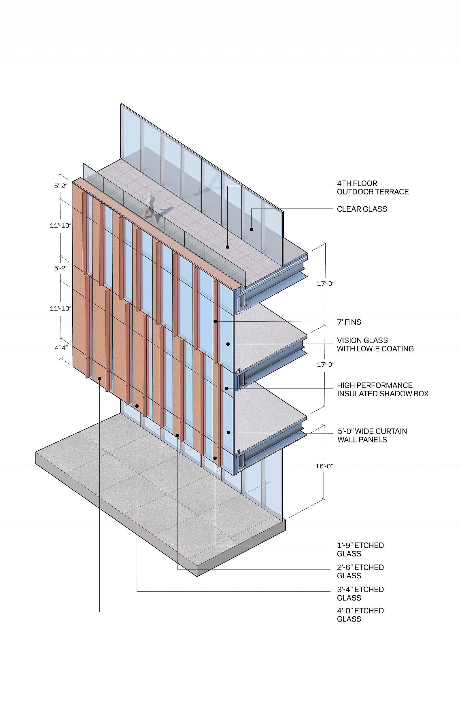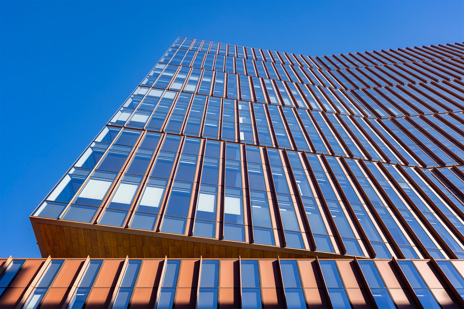 The building's massing reflects its distinct programs: street-level retail and museum spaces are nested below a 4-story plinth. A faceted tower above accommodates open-floor work areas for a mix of established research-focused companies and startups. The scale of the plinth relates to Kendall Square's low-rise historic neighborhood and the design of its exterior, articulated by a sequence of terracotta-colored opaque and transparent glass panels, communicates chromatically with its surroundings.