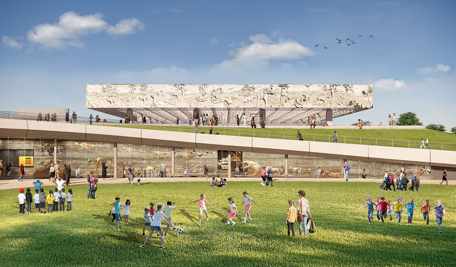 Framed views throughout the park and museum bring into alignment the research and museum collection that contains over 3.5 million specimens. As flexible armatures, loops and lenses connect and reveal, forming a continuous journey that tells the story of La Brea Tar Pits and Page Museum: the continuum from prehistoric time to our contemporary moment. The museum's treasures are revealed to visitors, bringing the museum to the park, and the park into the public imagination.