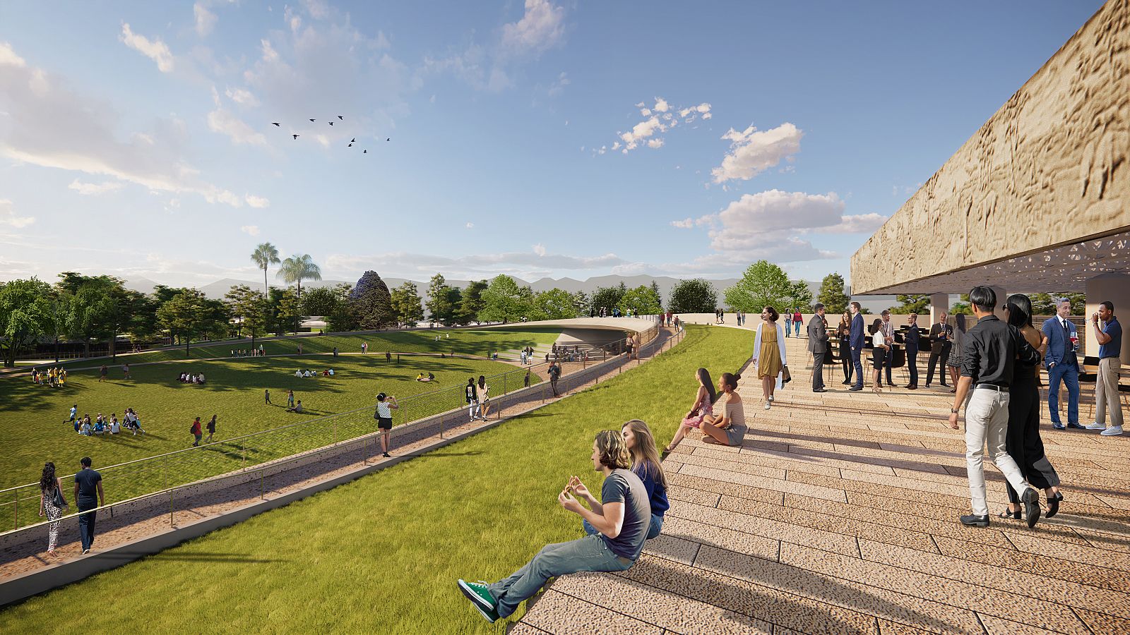 The new 1-kilometer pedestrian path crosses over the Lake Pit, frames views into the museum, enhances amenities for community engagement and research, and reveals the riches found in the tar pits and museum. As a vibrant public park, active exploration is complemented with lookout platforms along the loop to provide more intimate spaces for refection. Students and curious adults can observe excavation and investigation in action.