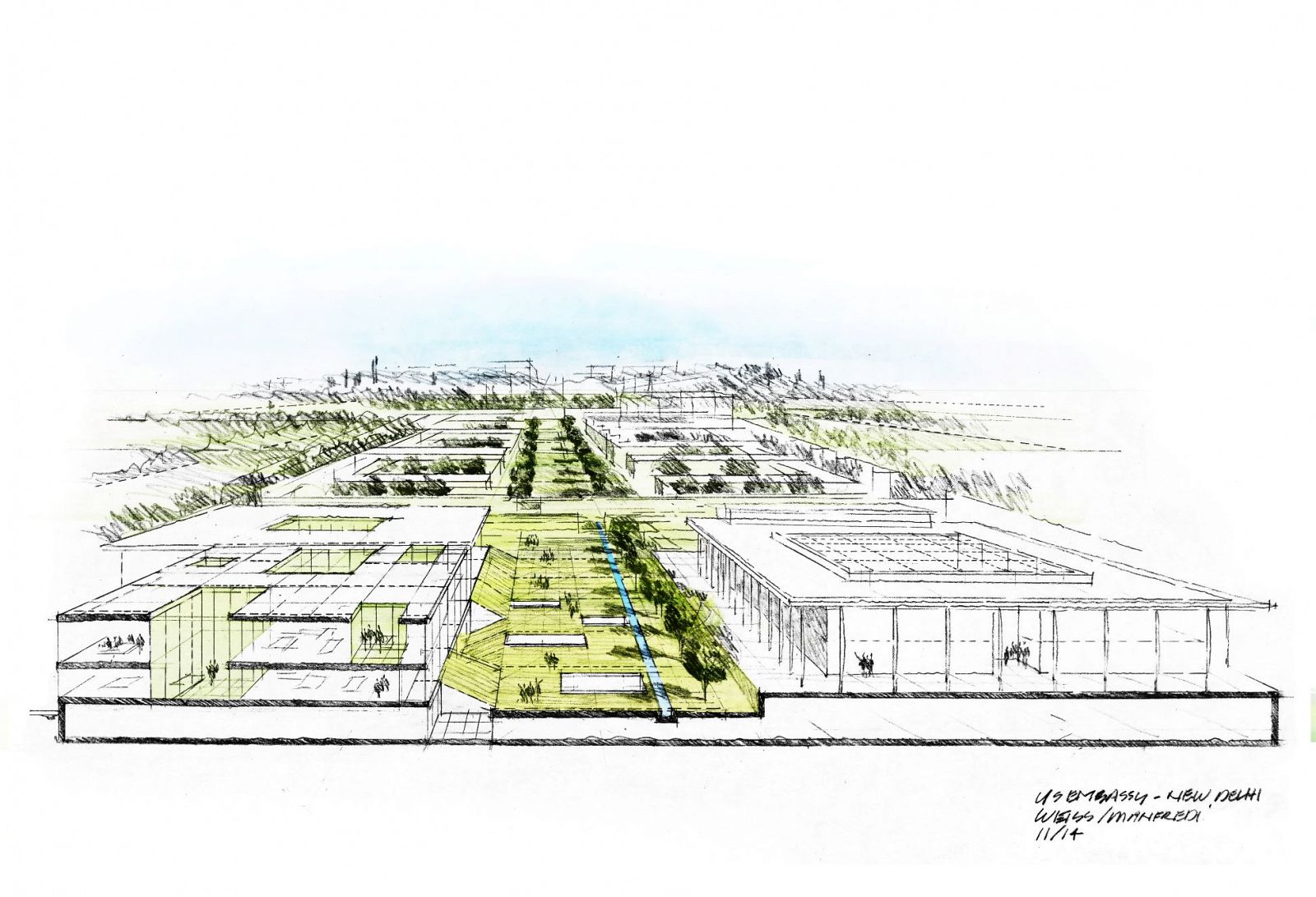 Weiss/Manfredi has been commissioned by the Department of State to re-envision the iconic embassy compound in New Delhi, India. The new design restores the early modernist Chancery Building and recasts the 28-acre embassy compound into a multifunctional campus. It builds on research into traditional Indian architecture and landscape as well as a consideration of the Embassy’s current needs for space, security, and sustainability.