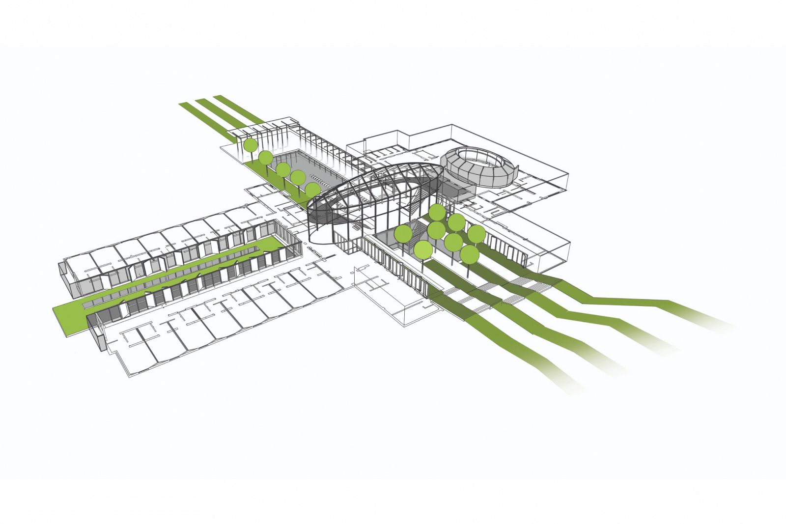 Two intersecting landscapes, organized into four gardens, are inscribed into the existing collection of early twentieth-century buildings, creating a framework for connecting the renovated and programmatically transformed structures. At the center of these landscapes, a new gallery wing, rendered in steel and glass, replaces the existing boarding house and creates a setting for informal gatherings.