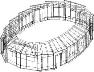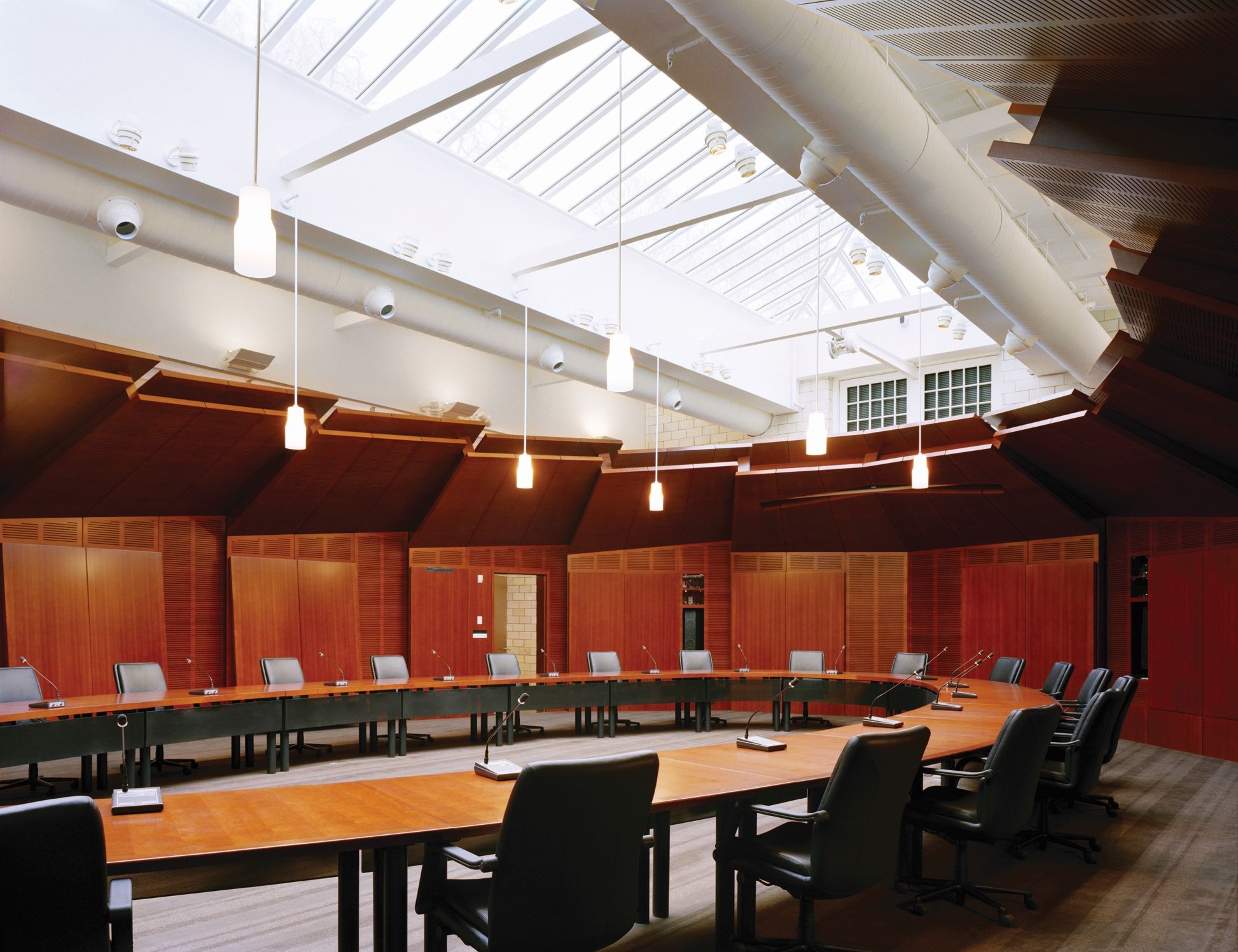 The wood elliptical enclosure of the formal conference room is insterted within the volume of a former garage. Interlocking cherry wood panels are cantilevered from the floor and perforated for optimal acoustics.
