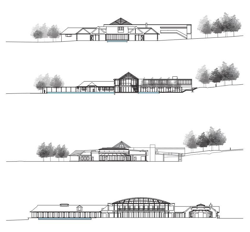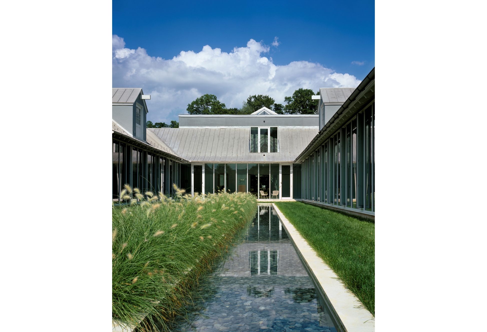 The north-south landscape is defined by an unbounded linear organization of water, trees, crushed stone, and flowering ground cover. A linear reflecting pool at the north end provides a formal environment for arrival; a more informal setting of water, trees, and outdoor seating defines the south garden. The east-west landscape links the renovated garage and stables, capturing residual exterior spaces and turning them into cultivated gardens.