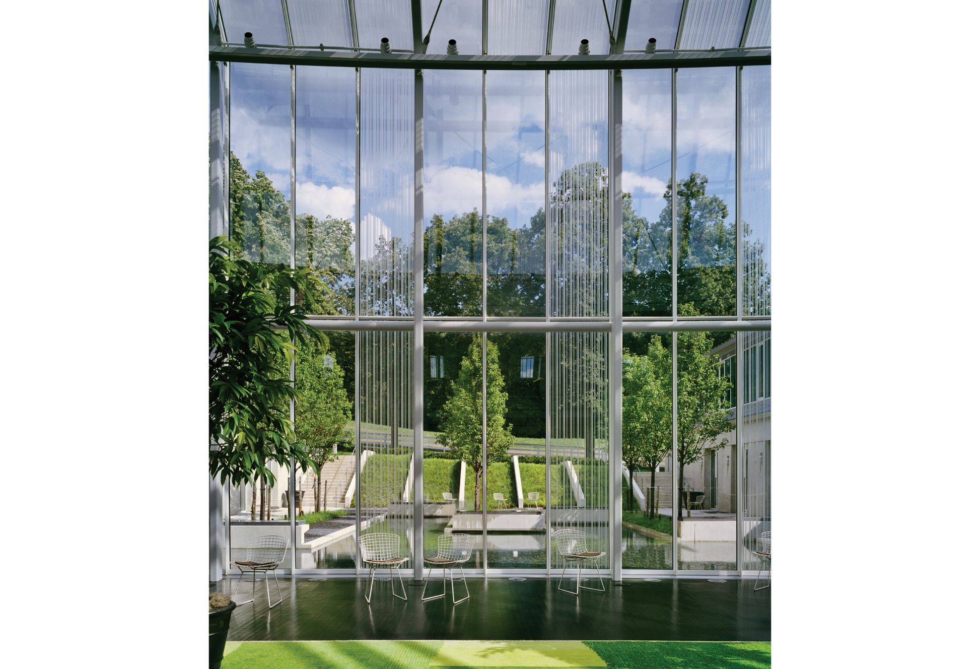 The gallery, conceived as a conservatory structure located at the intersection of two crossing gardens, includes indoor plantings and a custom designed rug woven with thiry-six shades of wool, emulating the estate's mowing patterns.