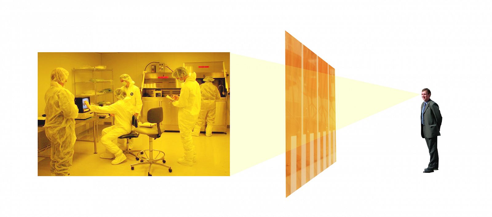 We are also aware of the material resonance of our thinking about the furnishings. At the University of Pennsylvania’s Krishna P. Singh Center for Nanotechnology, the translucency of the amber glass protects the research inside. We wanted to bring that luminosity of amber into relation with the people outside of those spaces. This polished amber resin is completely transparent on the side, and yet on its surface there is a very soft etching with a soft sand to show how one material can take on many lives.