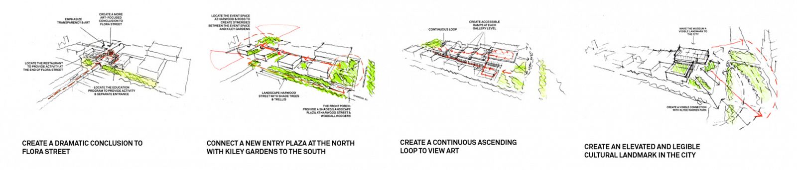 Our design activates latent reciprocities between art, architecture, and landscape to form a new tapestry for the arts. The introverted and fortified expression of the museum, with a cadence of gardens and galleries, is transformed through a meticulous integration of ecology and art to weave the museum into the fabric of the Arts District.