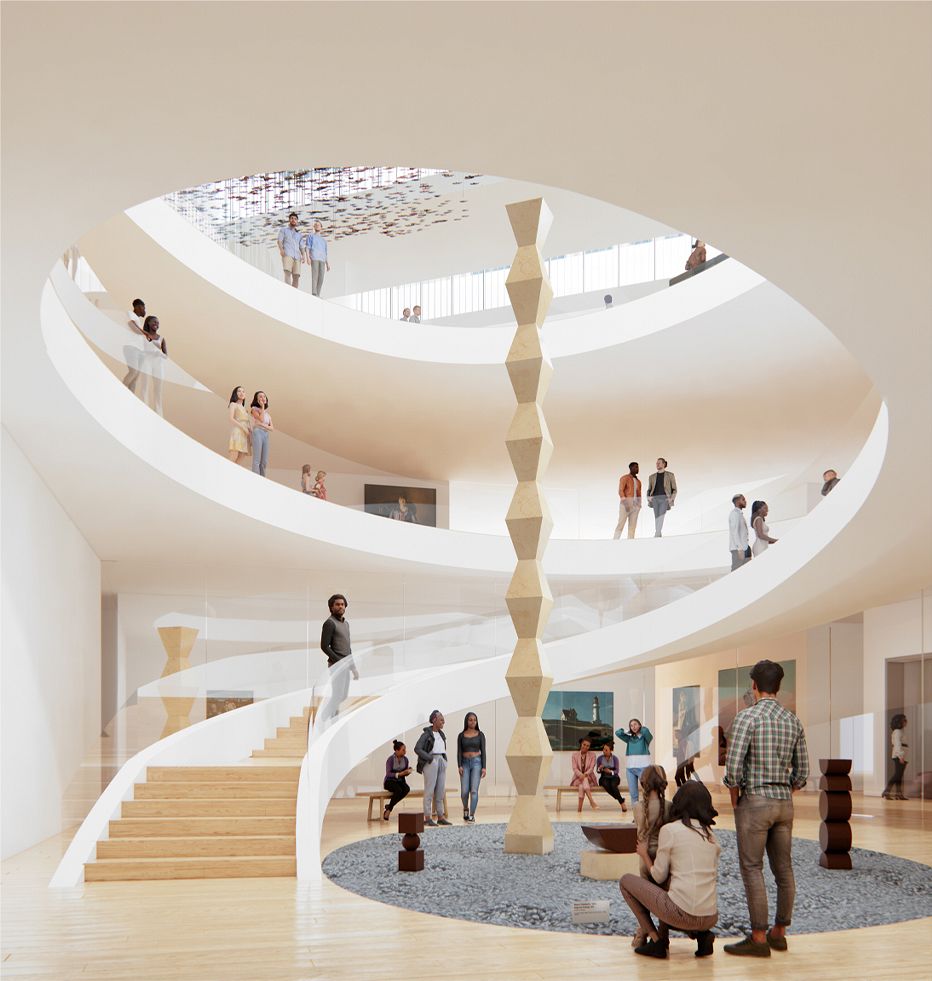 Art needs room to breathe: the choreography of a continuous journey requires both clarity of circulation, ease of access, and an invitation to wander. With stairs that separate levels and walls around outdoor spaces, the museum's current stepped galleries form barriers to enjoying the art. Our design introduces ramps alongside stairs and new ascending parallel galleries to enable a continuous and accessible flow. Clear sightlines through the ascending galleries are punctuated by a central filtered light, clarifying navigation throughout the collections. The ascending galleries conclude at the top with a new cantilevered gallery that hosts contemporary collections and literally extends the sequence into the horizon of the city—both indoors and out.