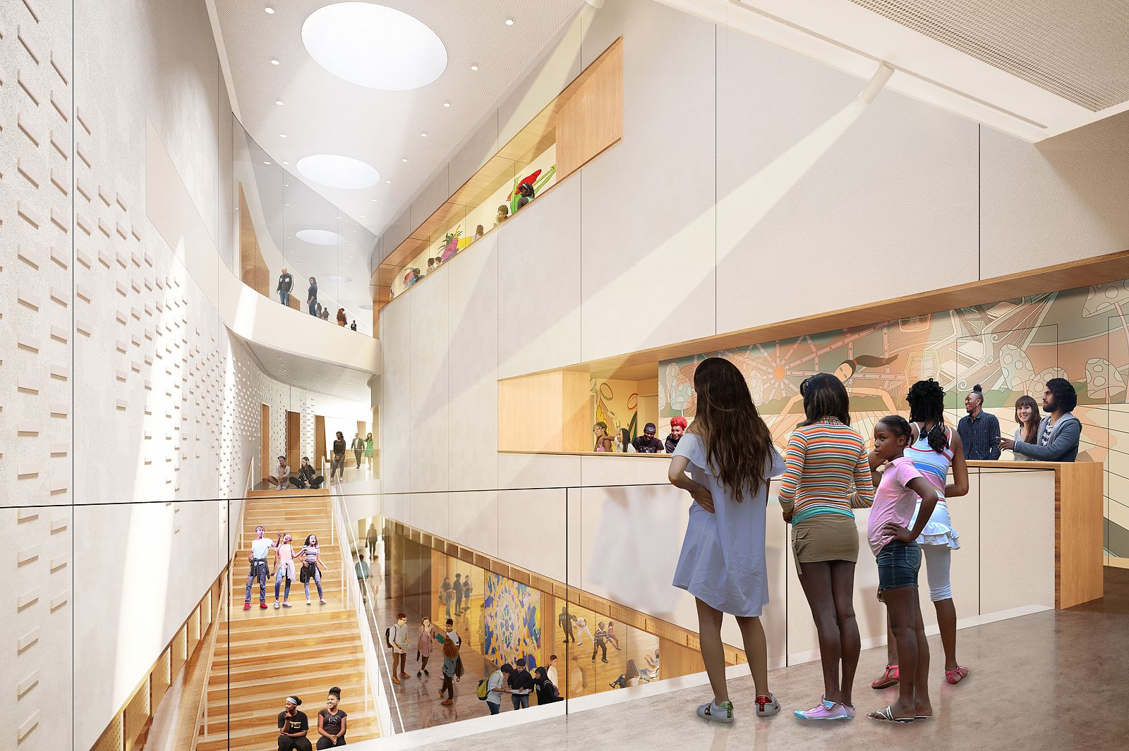 Generous light-filled lobby for impromptu performances and visual connections between professional artists and students.