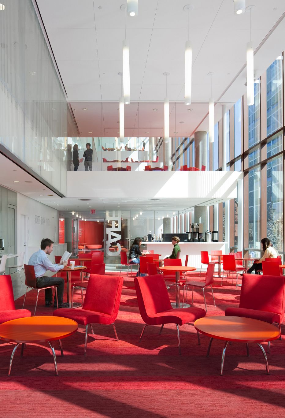 Carving a diagonal void through the building, the slipped atria create views through diverse program spaces.