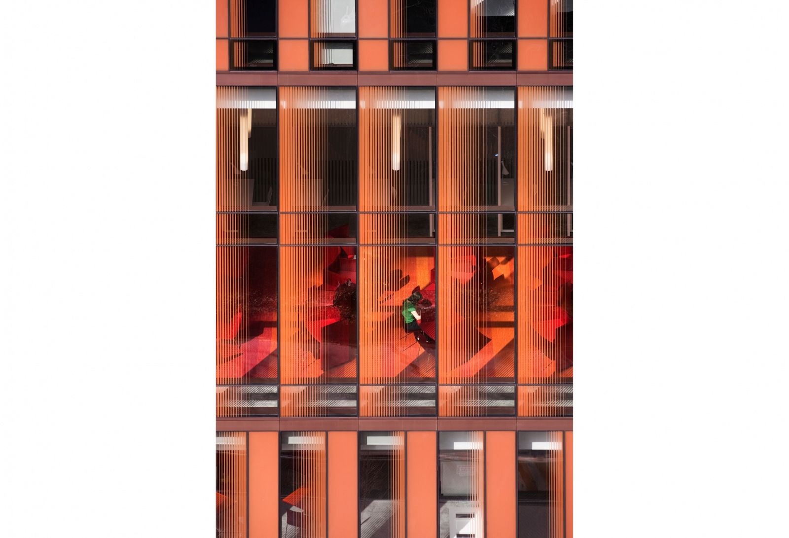The diverse programs of the building open to the light-filled atria and are connected by a series of ascending public stairs on the campus side of the building.