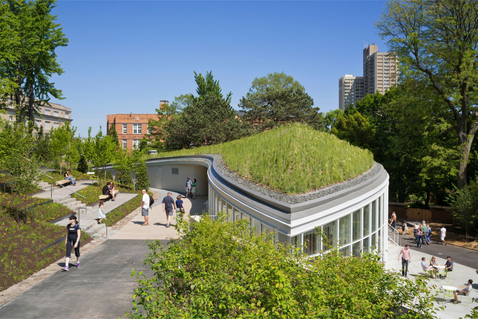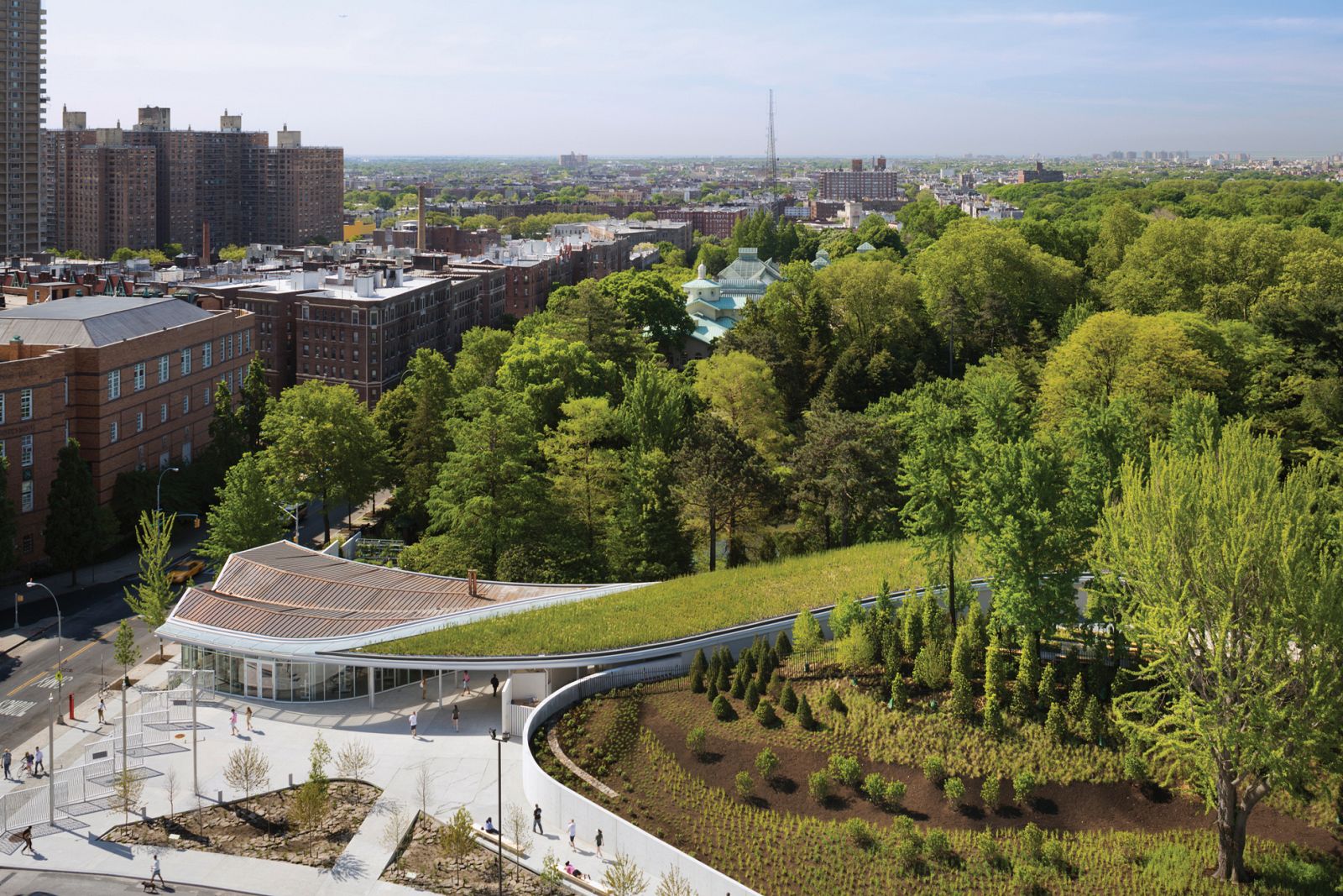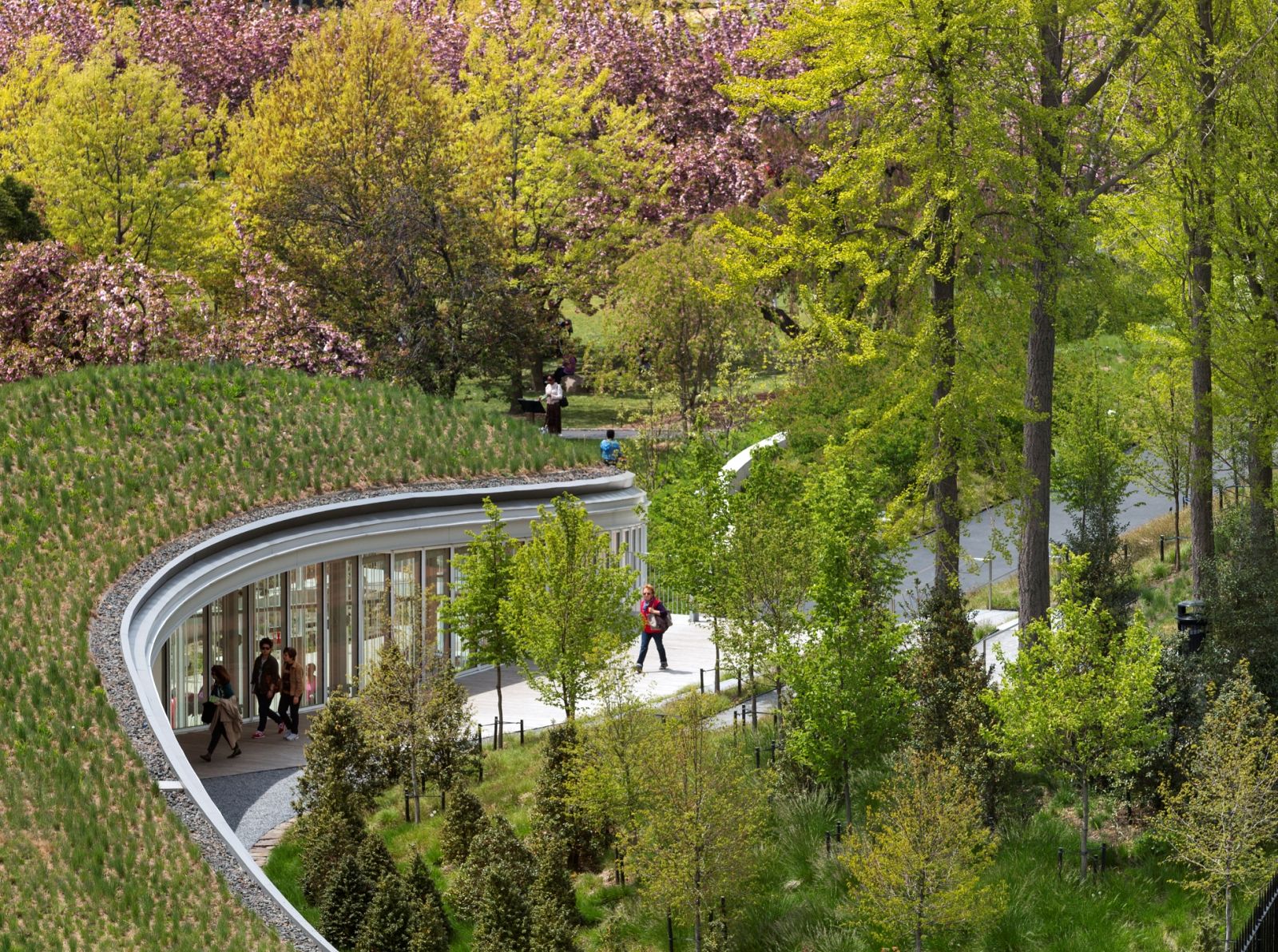 The Brooklyn Botanic Garden Visitor Center connects a collection of garden types, including a restored forest, a traditional rose garden, a formal cherry esplanade, and a Japanese garden.
