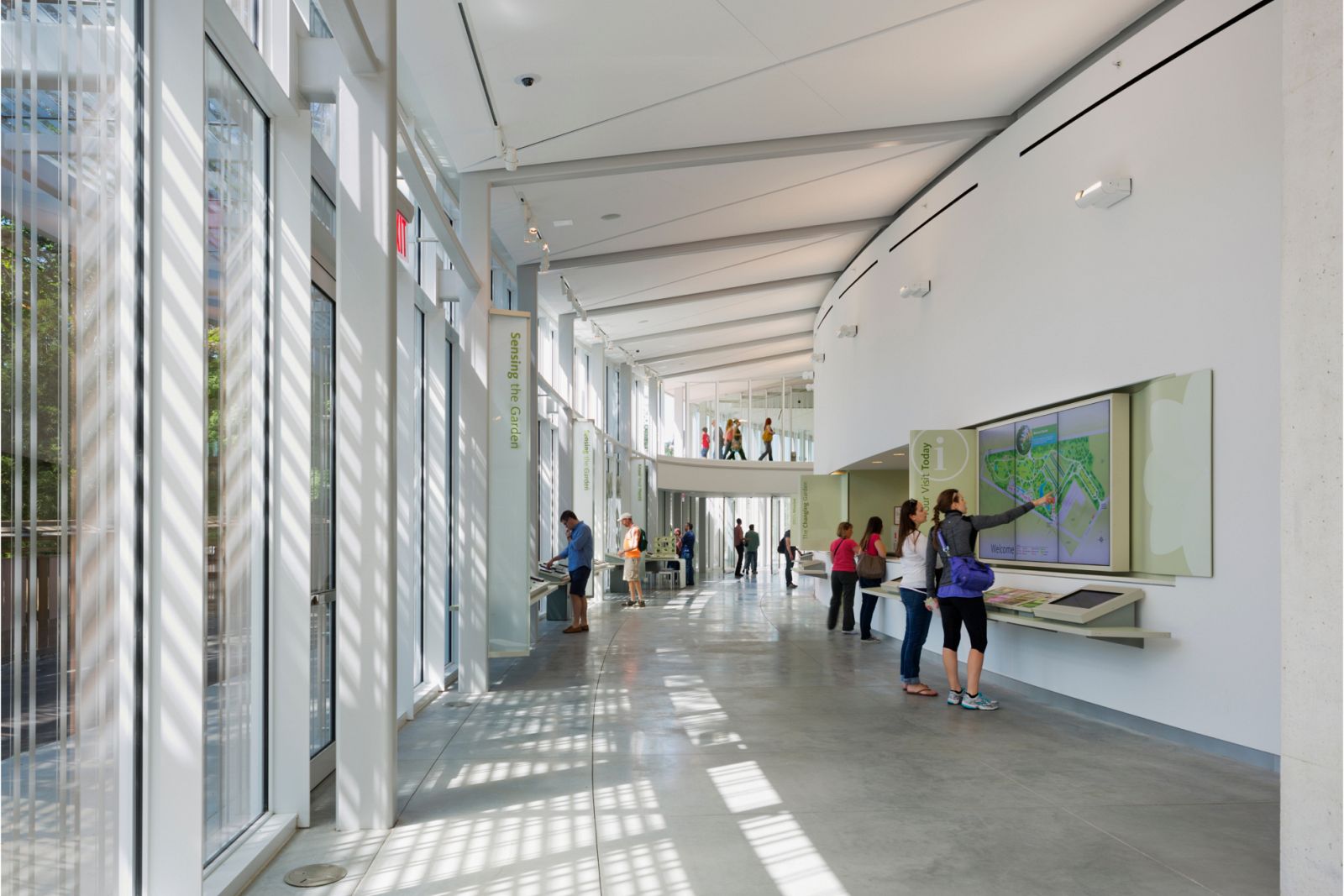 The Visitor Center's educational hallway, shaped by curved glass walls, allow for veiled views of the garden across the length of the site.