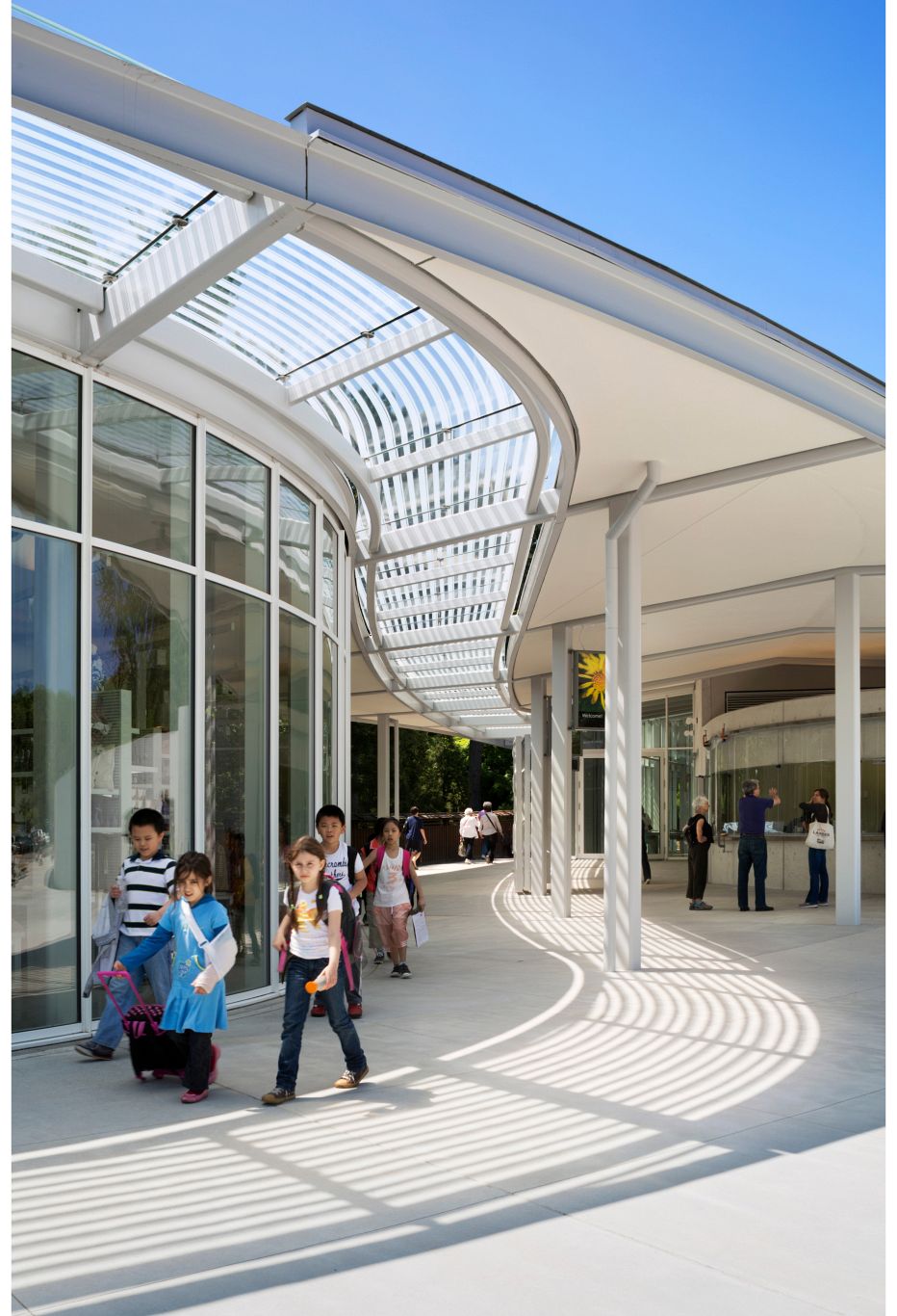 A canopy shelters the main entry route to the Visitor Center. This route wanders through the building and connects to an upper-level garden path, allowing views of the garden to become both hidden and revealed.
