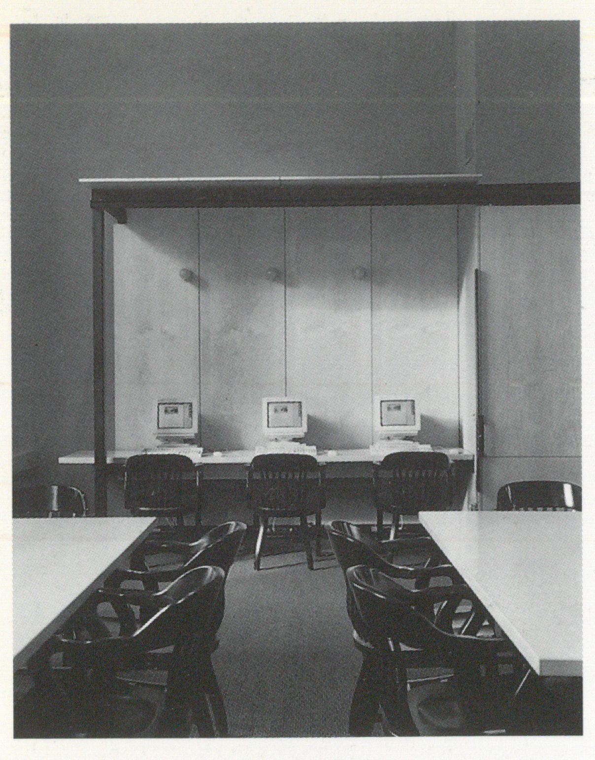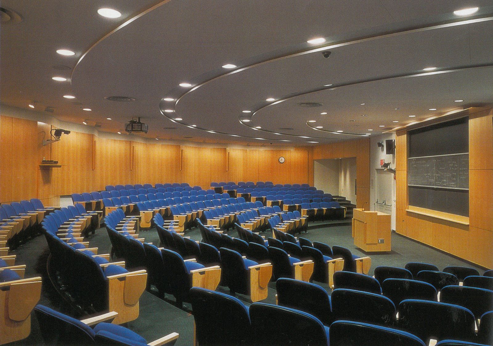 The auditorium for the Graduate School of Business was reconfigured to overcome difficult acoustics and awkward proportions. Interlocking folded maple walls, fabricated off-site and installed with cleats, correct the acoustics and provide a new liner to the room. The design of the movable media cabinets and podiums, like those in the Schermerhorn Auditorium, were incorporated into the design. The renovation of Schermerhorn Auditorium introduced complex audio-visual requirements in a series of ample furnishings. Media cabinets, projection booths, and fully wired podiums were designed for mobility and flexibility. New materials, such as clear maple and sleet provide sharp contrast to the original building envelope.