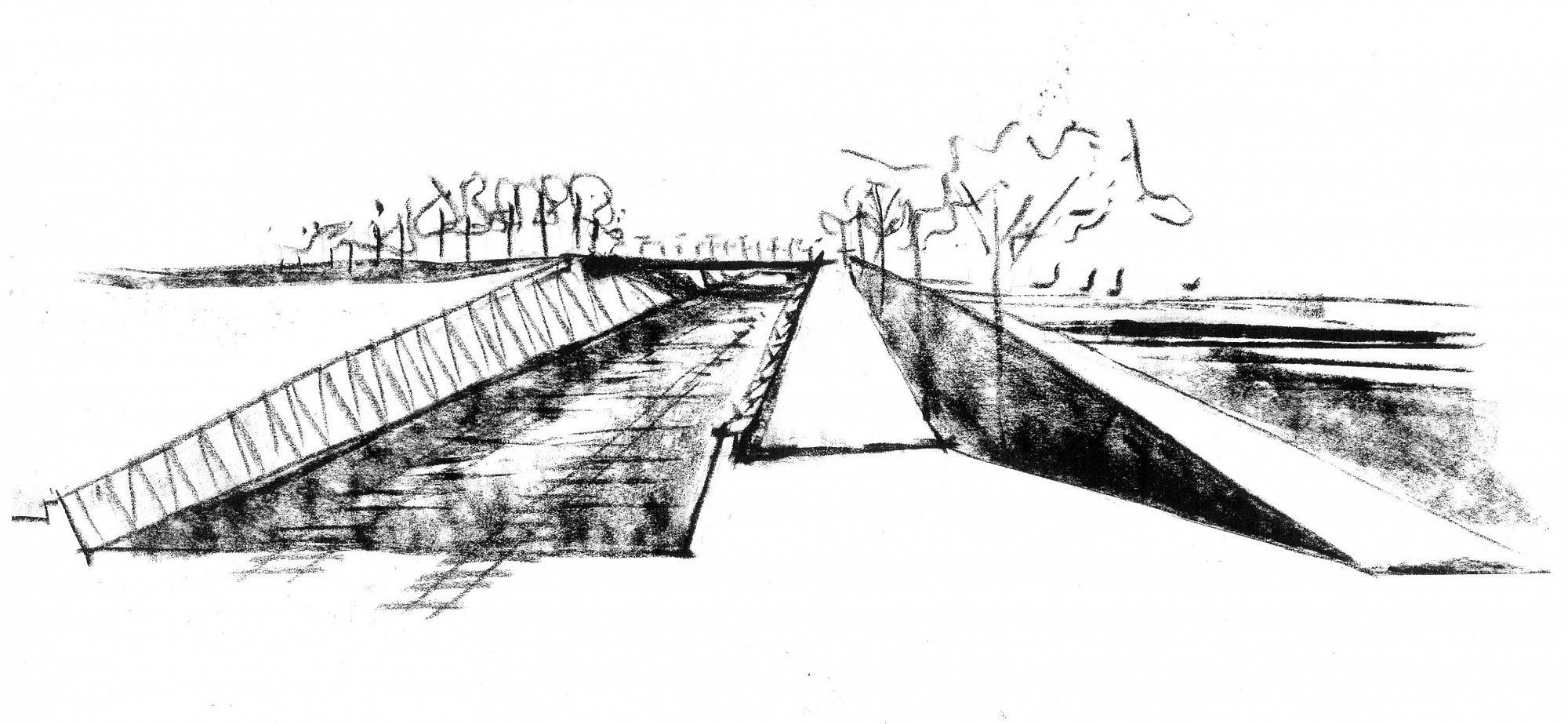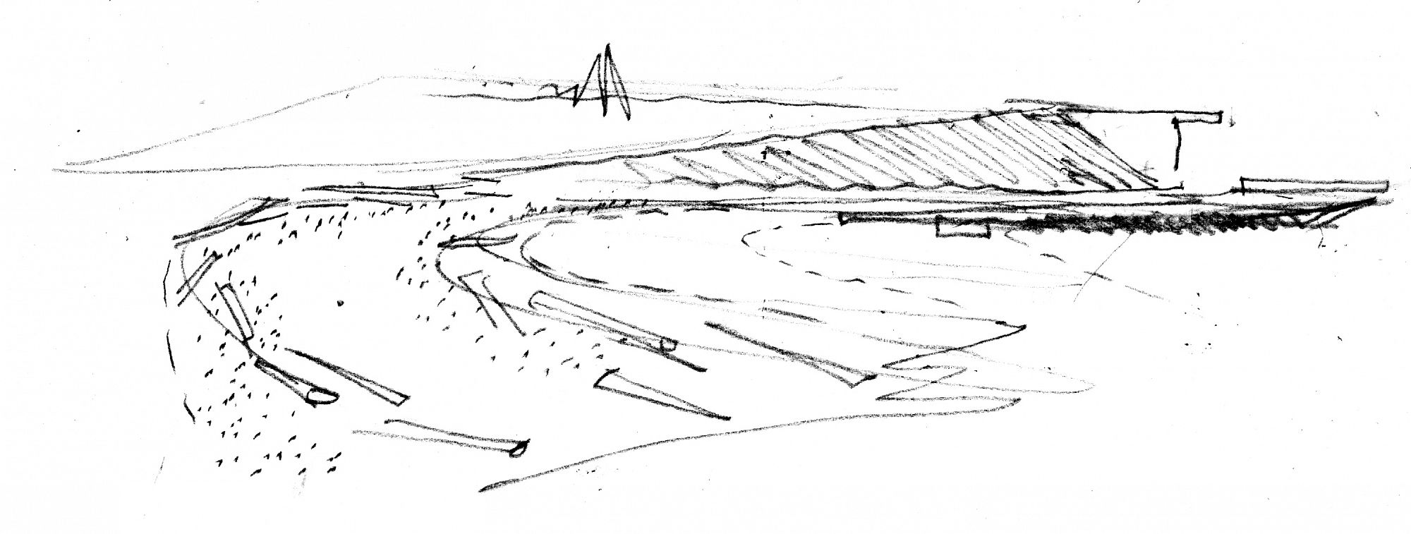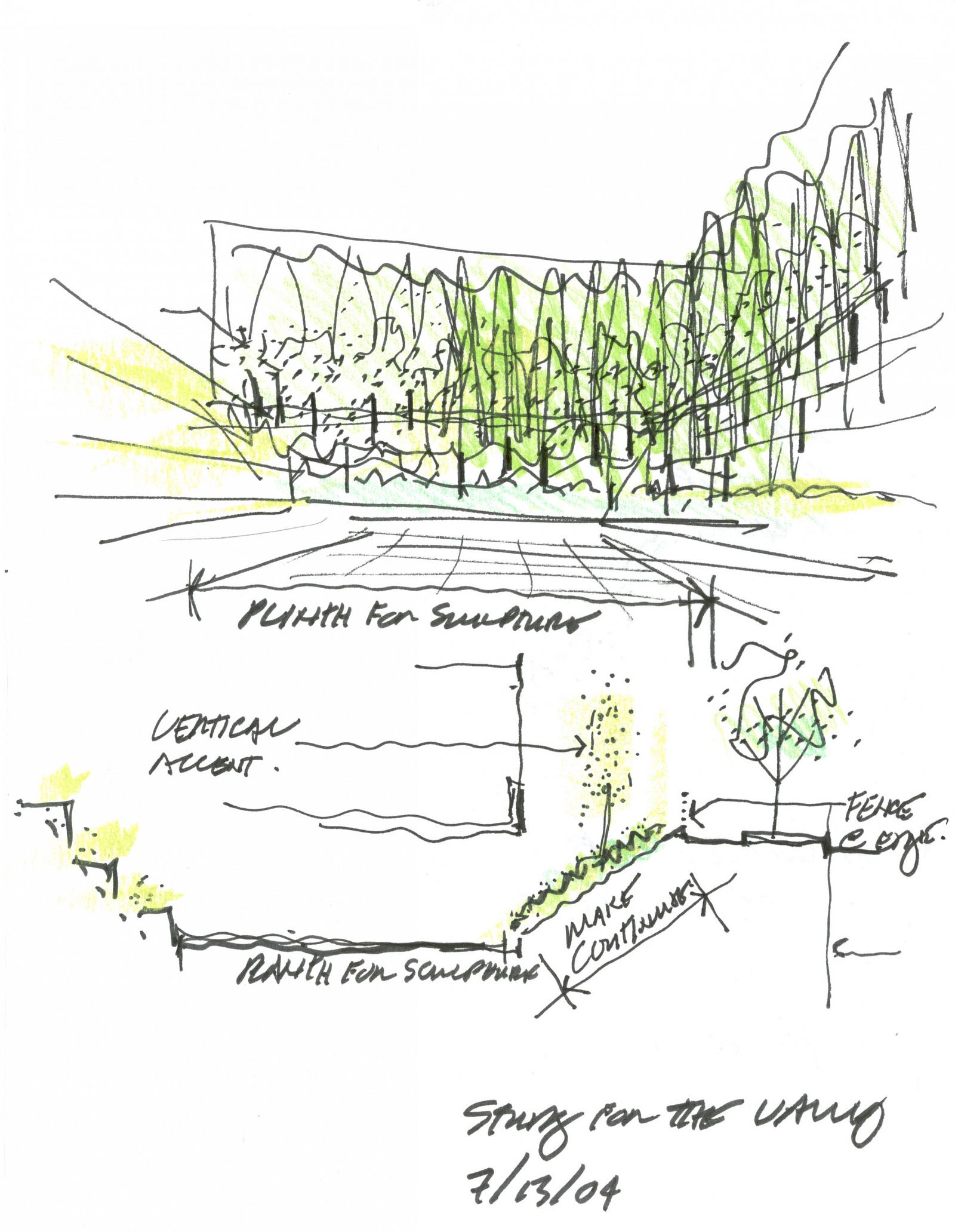 Richard Serra's Wake is sited amongst terraced zones for smaller sculptural works. A sequence of design adjustments were made to clarify the geometry of the valley precinct relative to the final placement of the piece.