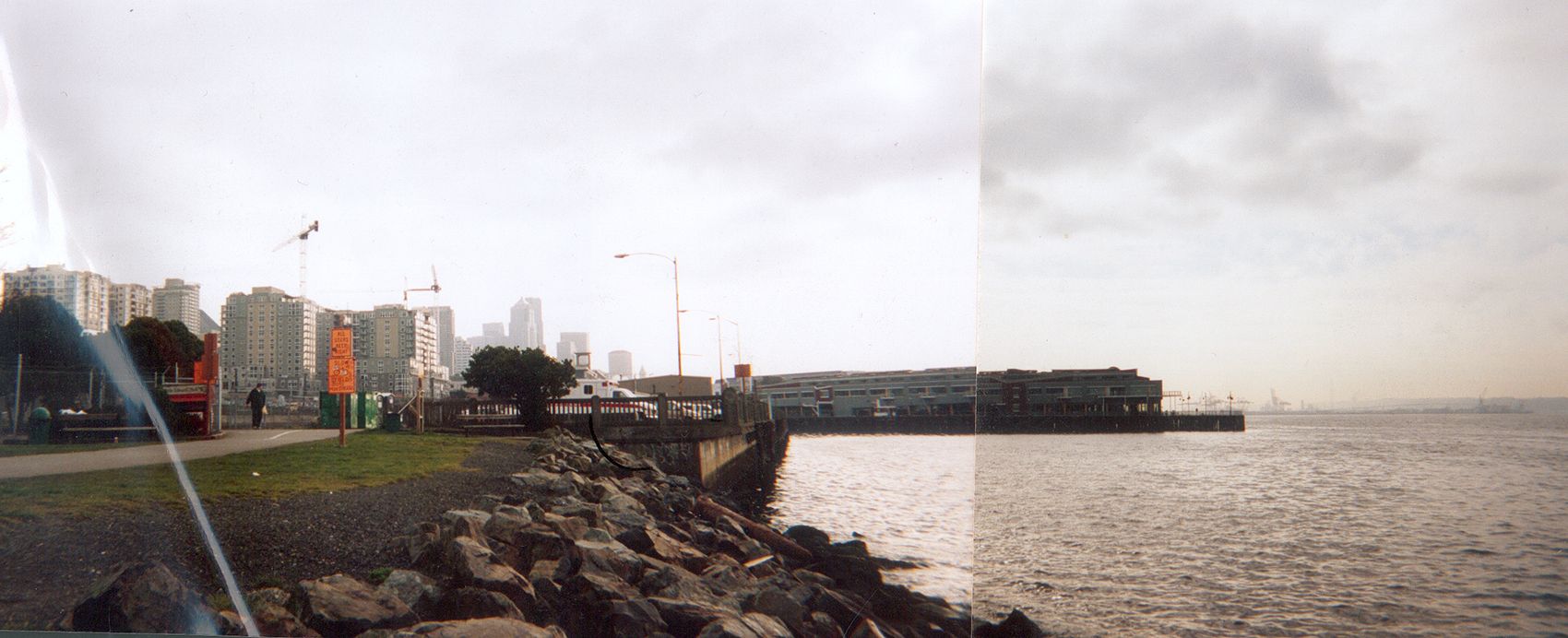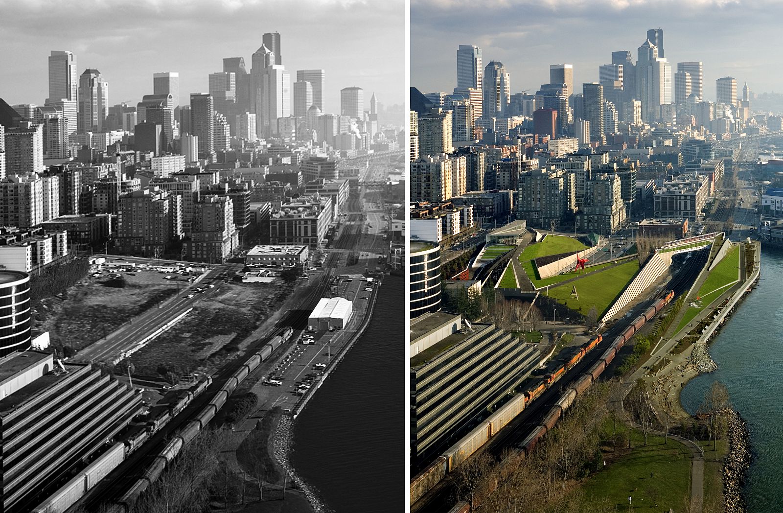 Three former industrial sites, located between downtown Seattle and the waters of Elliot Bay, were separated by roadways and rail lines.