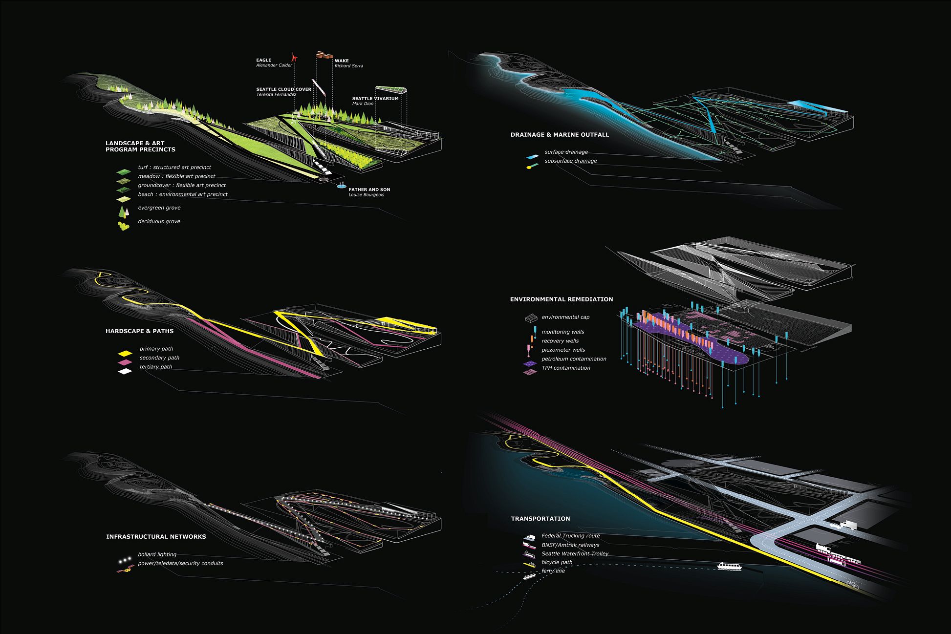 Each layer of the park meets different demands: art, landscape, and infrastructure are superimposed over remediation systems, drainage collection, and existing transportation routes.