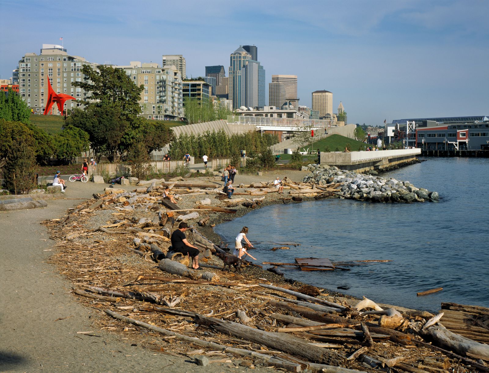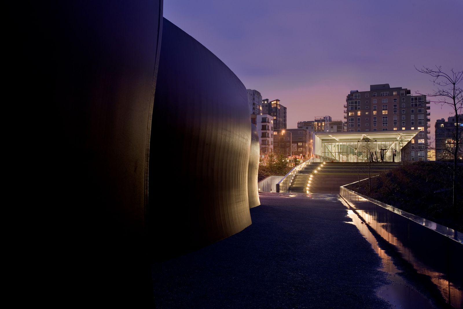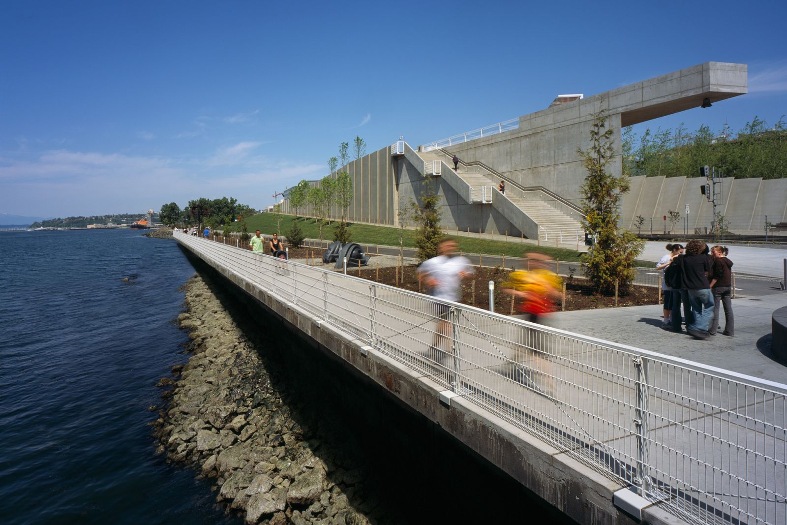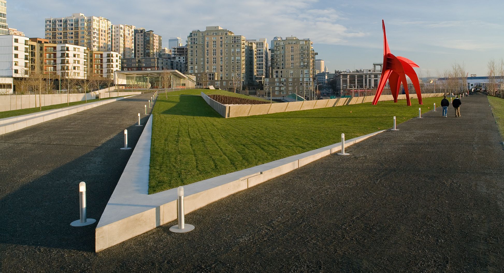 Envisioned as a new model for an urban sculpture park, the Olympic Sculpture Park is located on an industrial site at the water's edge. A continuous constructed landscape for art, the uninterrupted Z-shaped "green" platform rises over the existing infrastructure to reconnect the urban core to the revitalized Seattle waterfront. Descending 40 feet from the city to the water, the sculpture park capitalizes on views of the skyline and Elliot Bay.