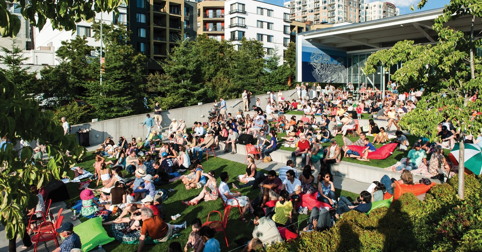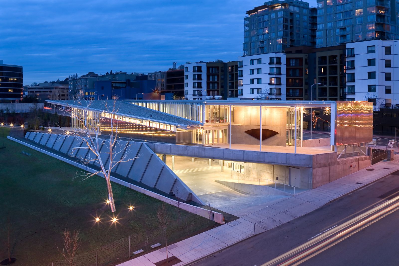 An 18,000-square-foot exhibition pavilion provides space for art, performances, and educational programming. From this pavilion, the pedestrian route descends to the water, linking three new archetypal landscapes of the northwest: a dense temperate evergreen forest, a deciduous forest, and a shoreline garden.