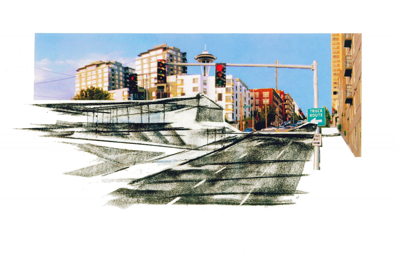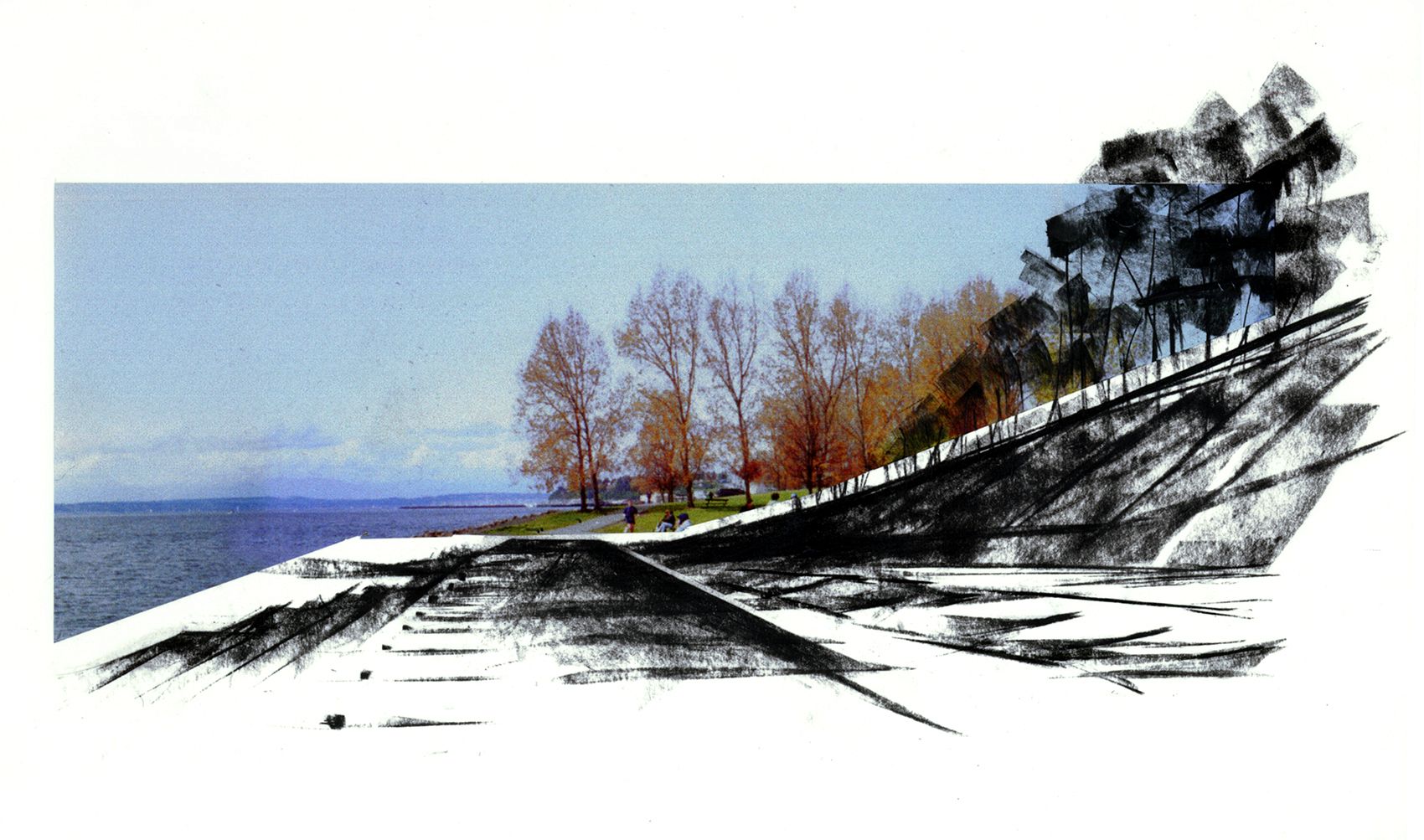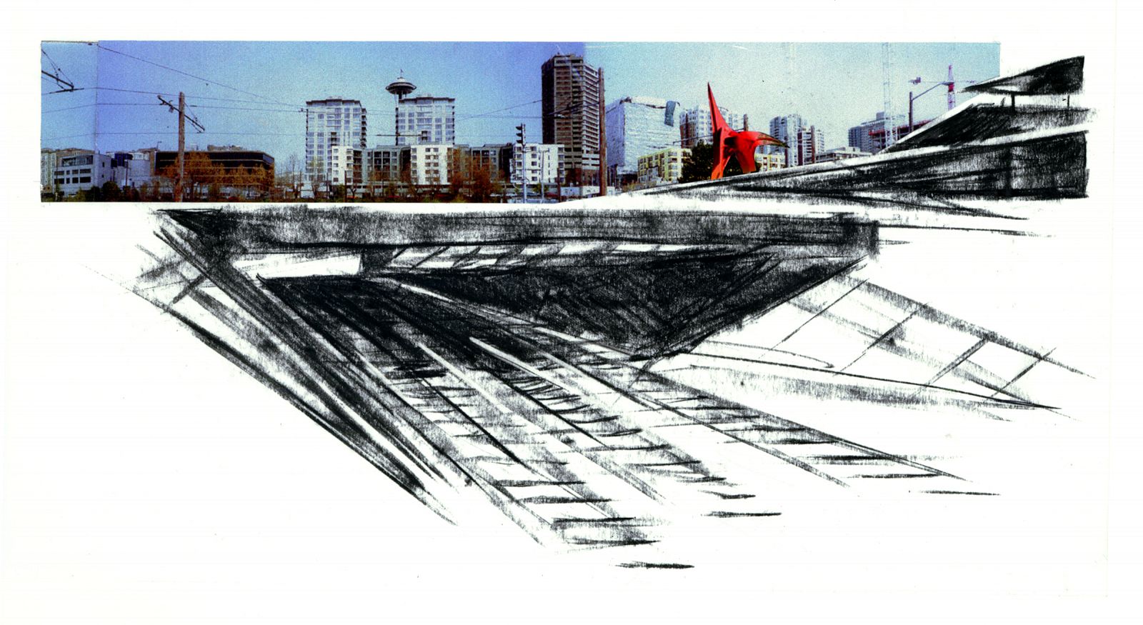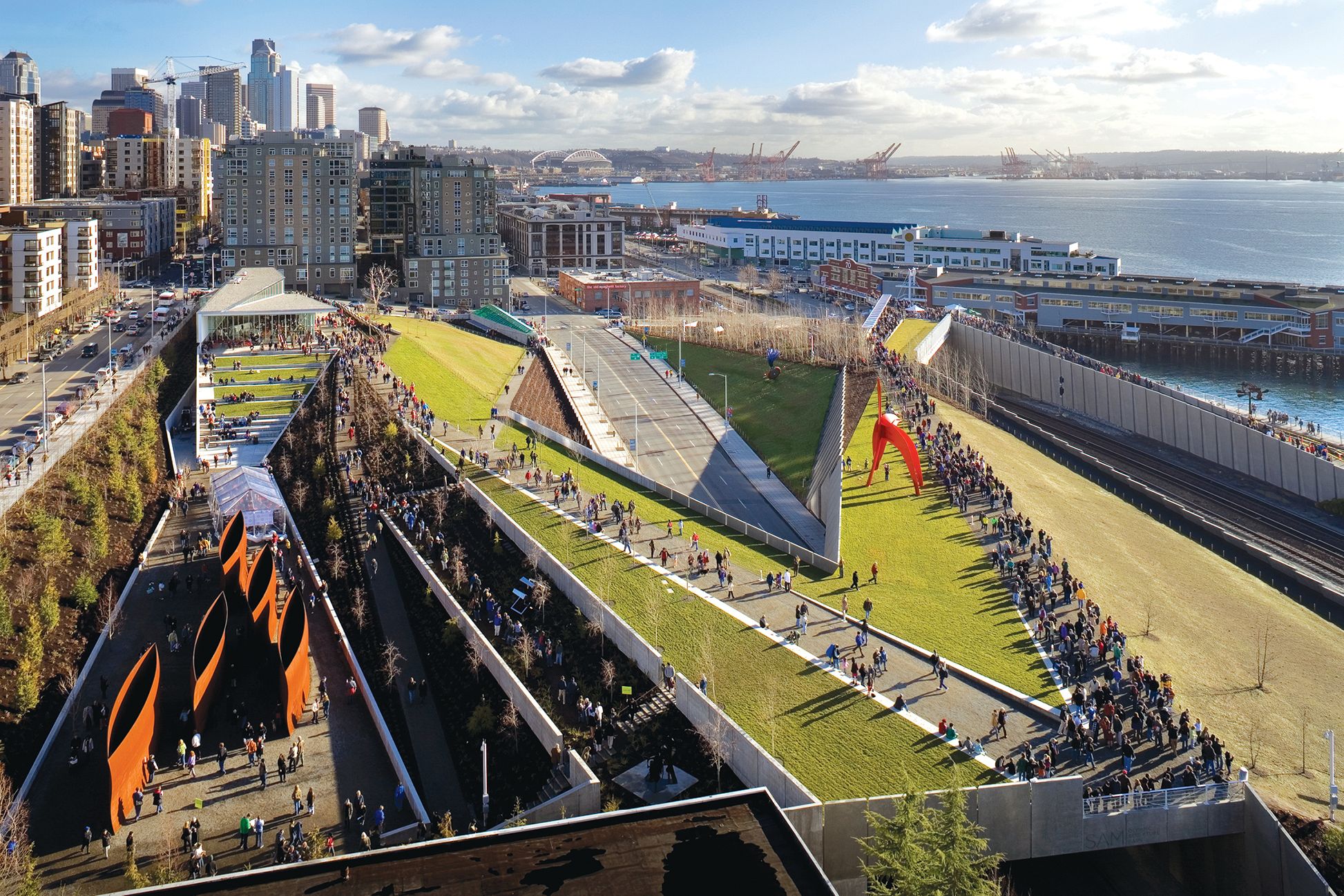 A continuous constructed landscape for art, the uninterrupted Z-shaped "green" platform rises over the existing infrastructure to reconnect the urban core to the revitalized Seattle waterfront.