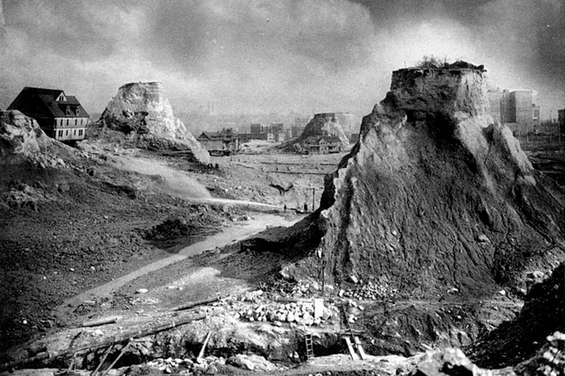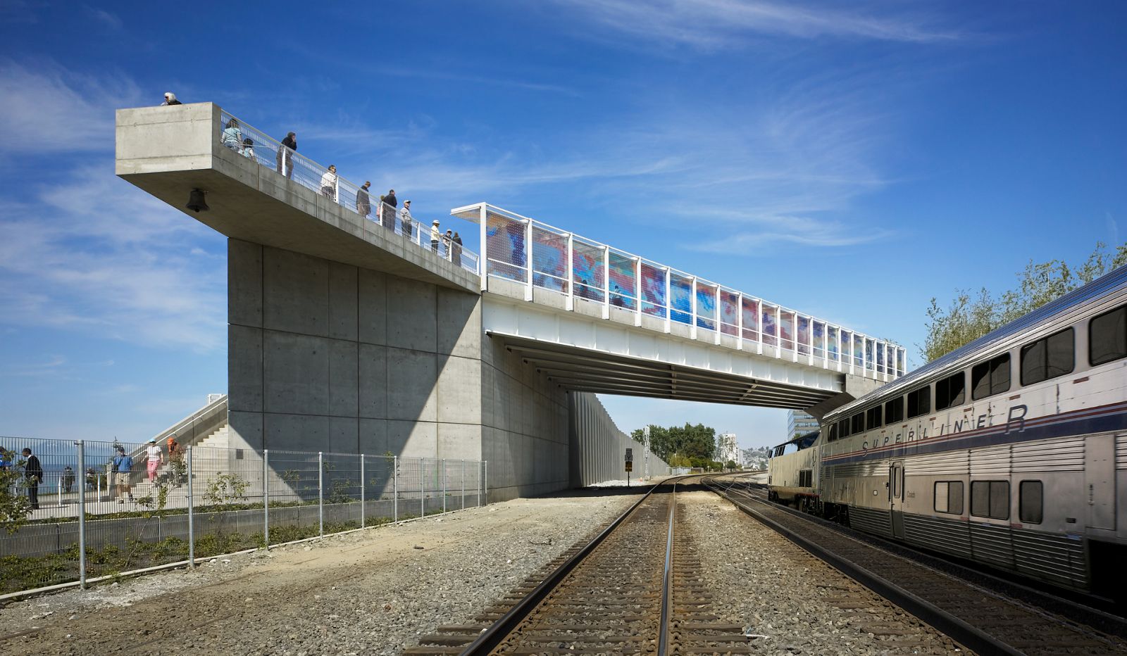The constructed landforms, linked by two bridges, form a continous topography that descends 40 feet from the city to the newly created beach.