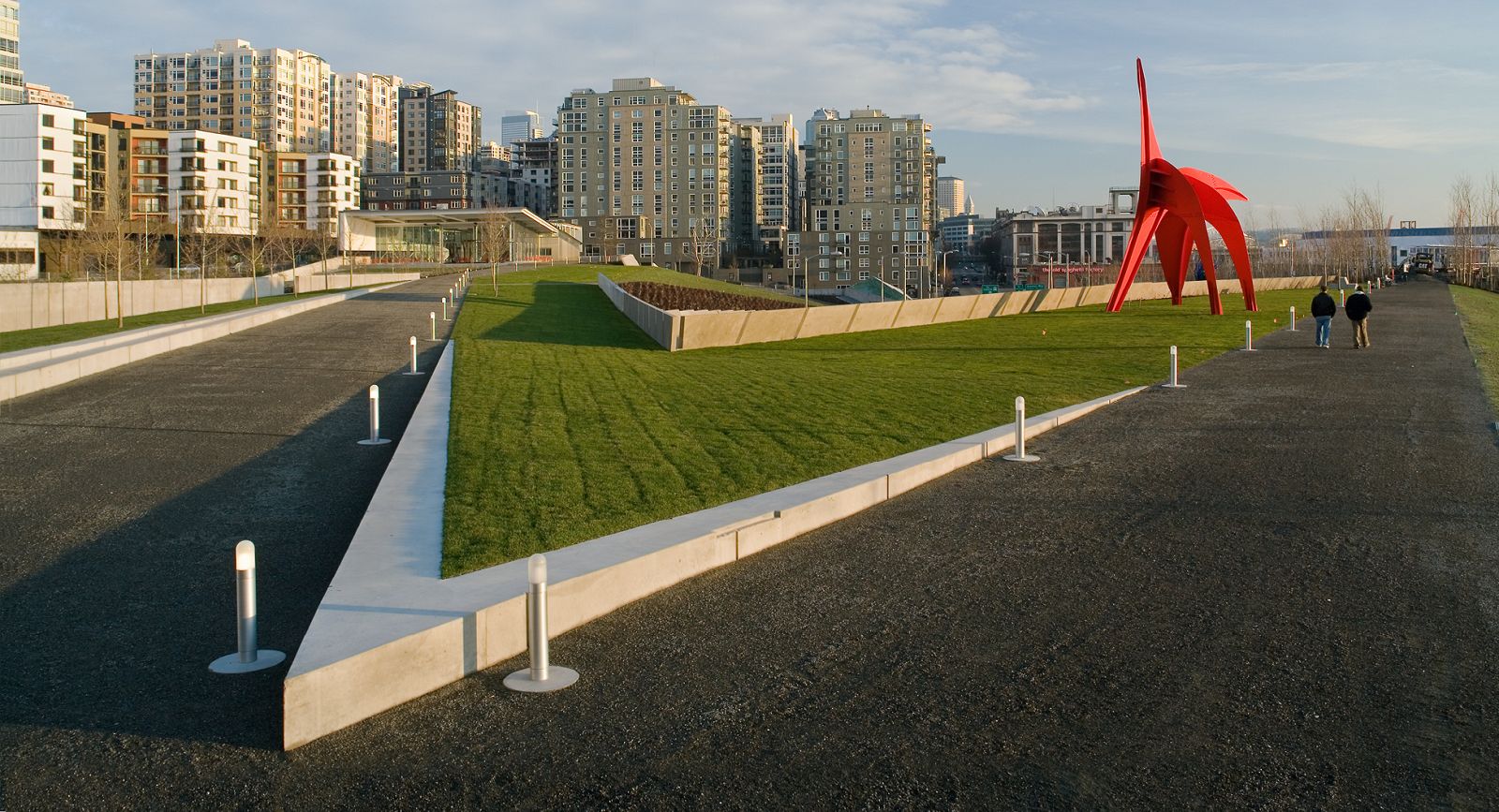 Alexander Calder's Eagle servers as the visual icon for the park and is perched over Elliott Avenue and seen in silhouette against the horizon.