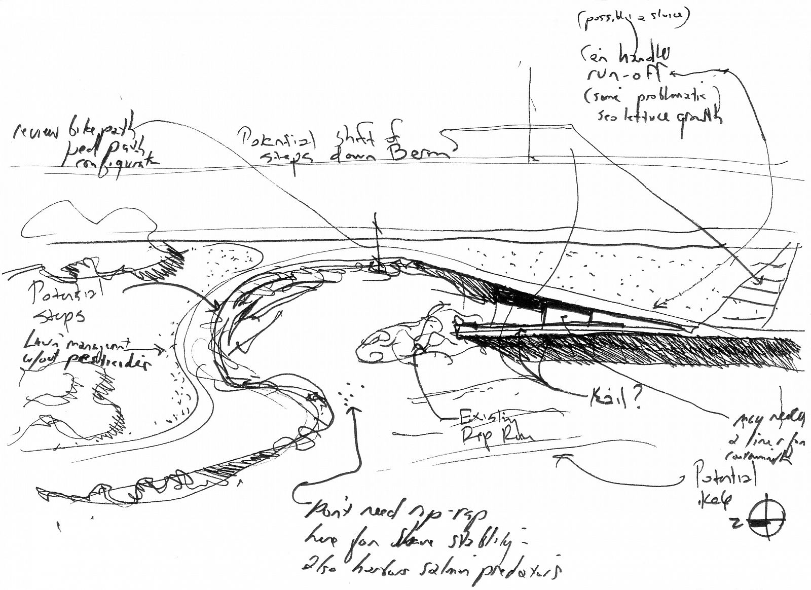 The newly designed beach encourages biodiversity on a site previously damaged by petrochemical waste. The new shoreline is designed with aquatic terraces that form a subtidal safe haven for a juvenile salmon marine habitat.