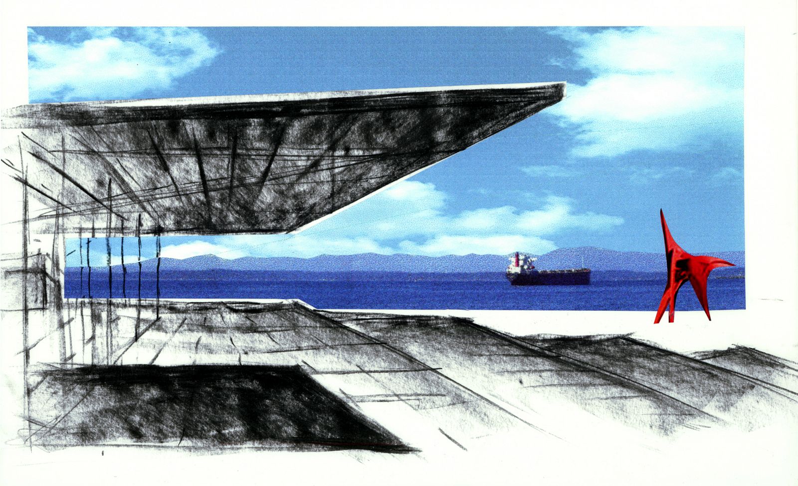The chameleon-like section reveals its multiple roles: to elevate the pavilion, cross a highway, bridge over train tracks, and reshape the waterfront.