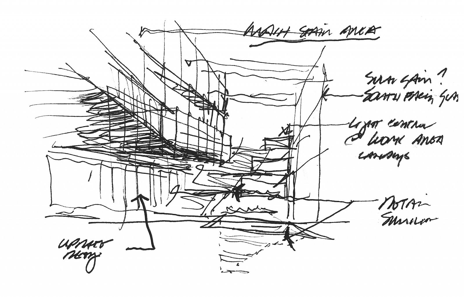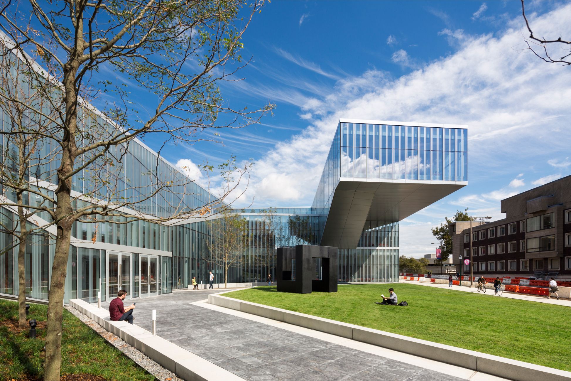 An ascending route climbs from the courtyard through the building to a forum space that cantilevers sixty-five feet over the courtyard below and frames views back to the heart of campus.