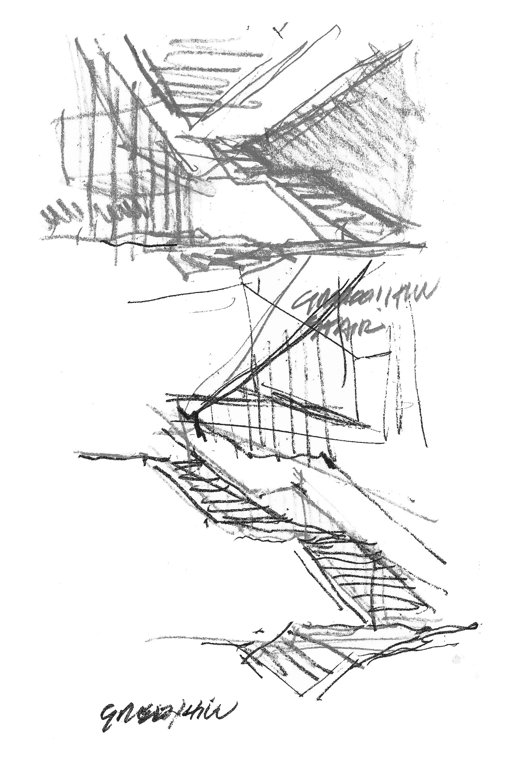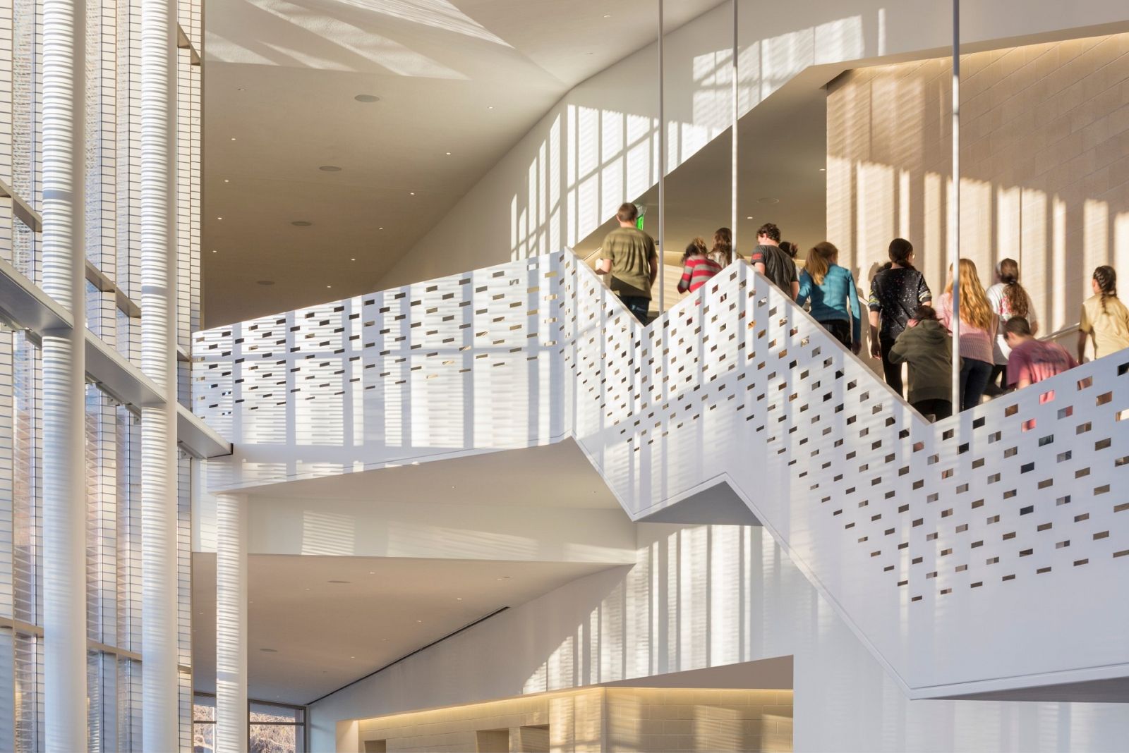 The building's main lobby and central steel staircase connect the vertically sectioned performance spaces, creating an entrance and gathering area that allows for "cultural frictions," as students of different practices brush shoulders.