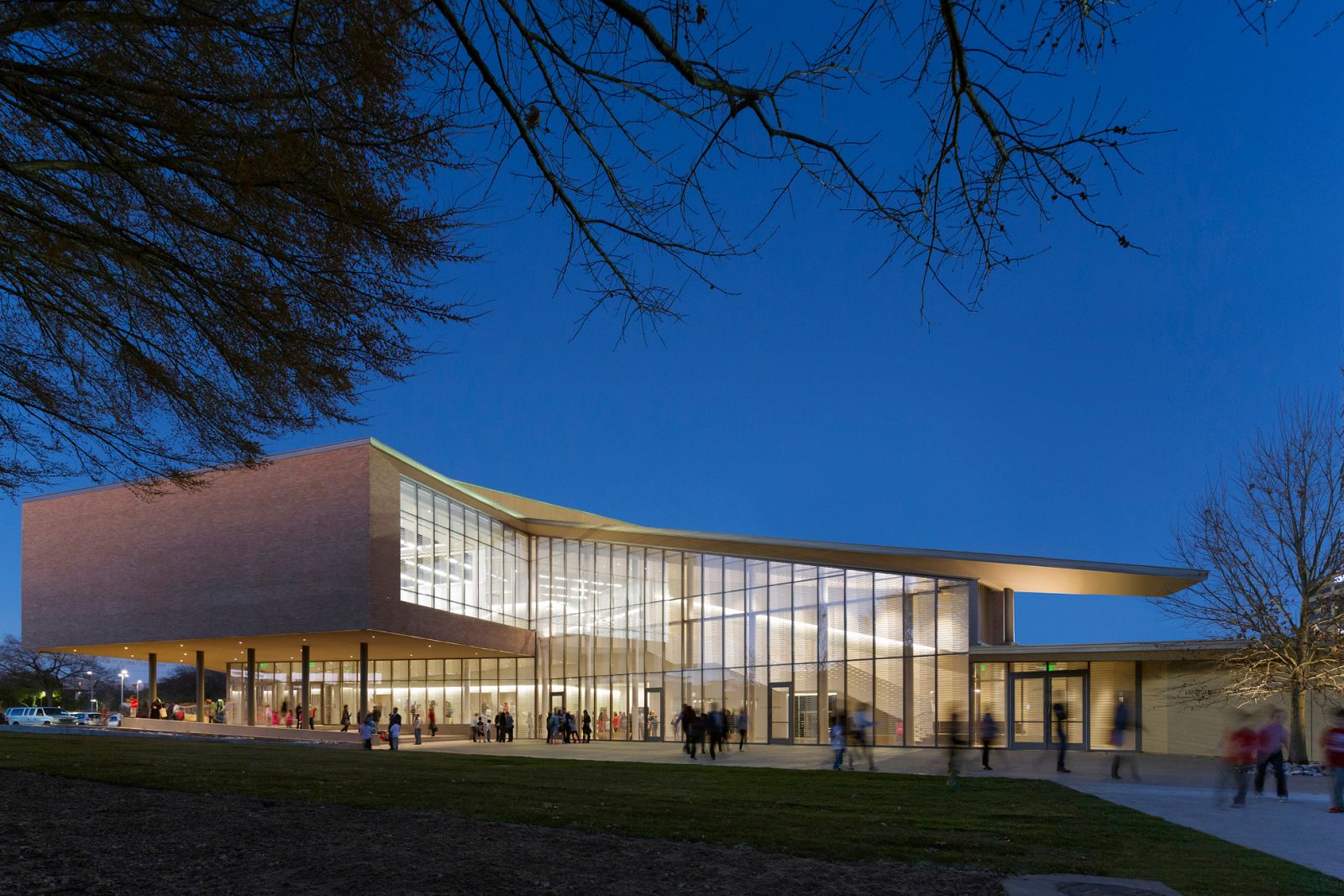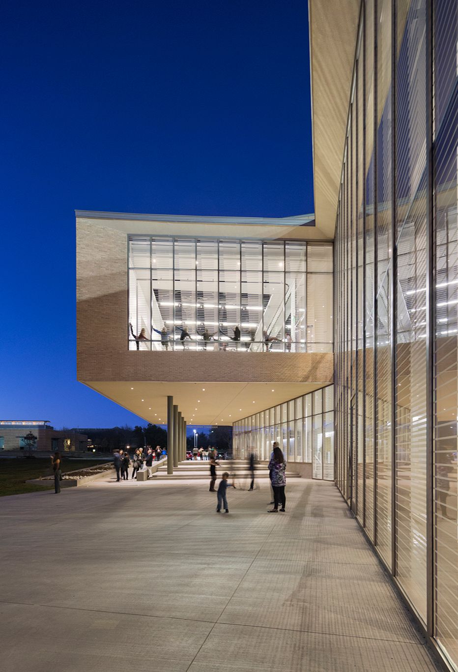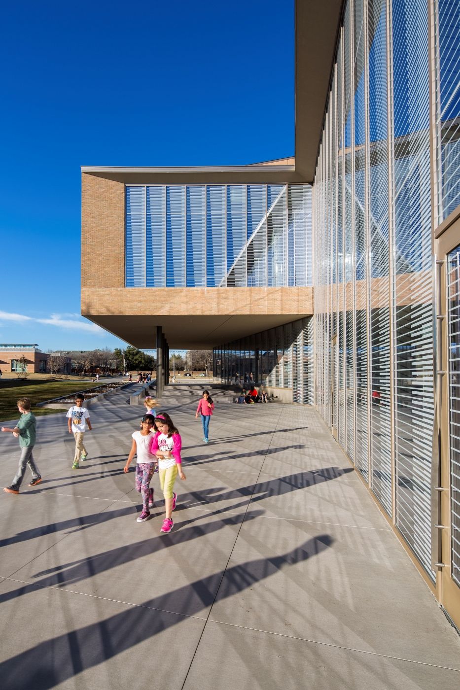 The Marshall Family Performing Arts Center is the focus of the performing arts at the Greenhill School. The design establishes a dialogue between building and campus: the building's configuration creates a sequence of spaces that shape an outdoor courtyard and frame views out to the existing campus. The courtyard is animated by the school’s double-height lobby. Designed to be an ascending gallery of collaborative spaces, the lobby connects all the performance venues and creates a destination for informal performances and spontaneous interactions.