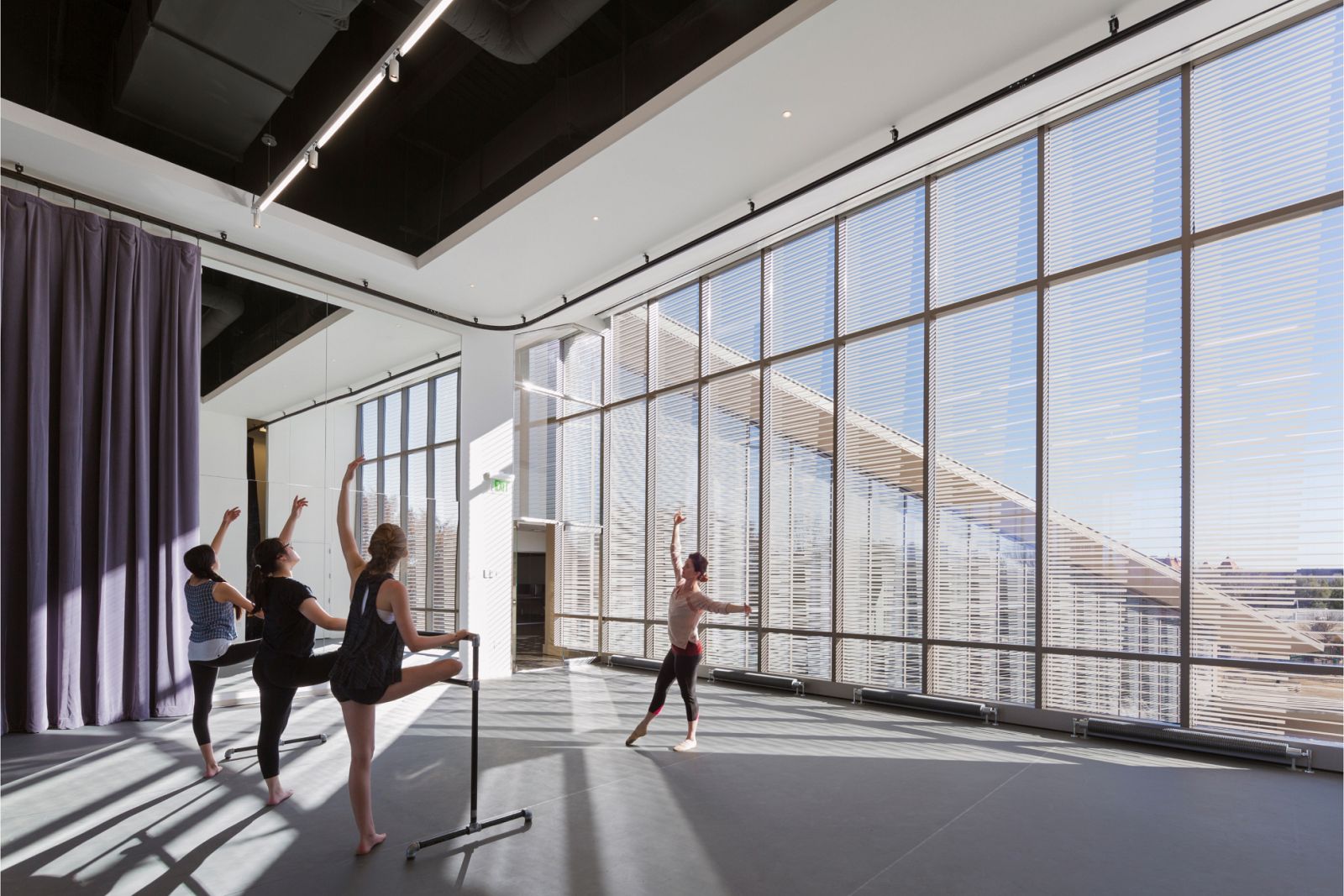 The window's screened layering system protects the performance spaces and performers from the strong sunlight while creating something artful and expressive in the process.