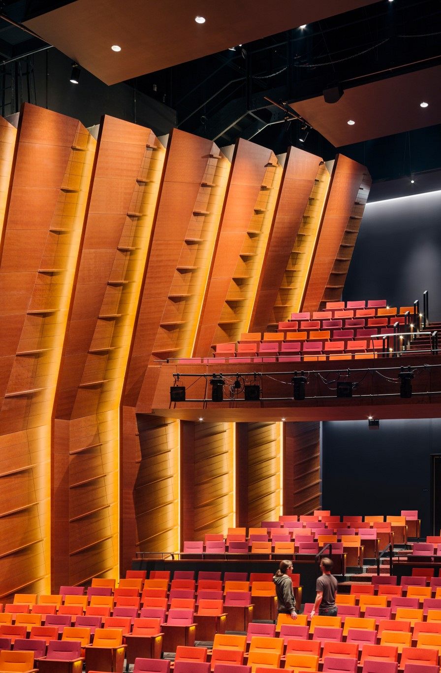 The 600-seat proscenium theater features cherry wood-paneled interiors and a range of desert-orange and crimson upholstered seating.