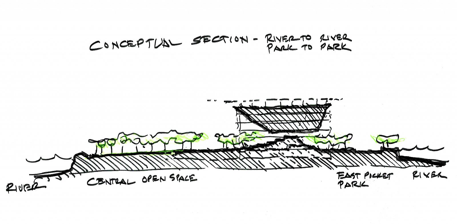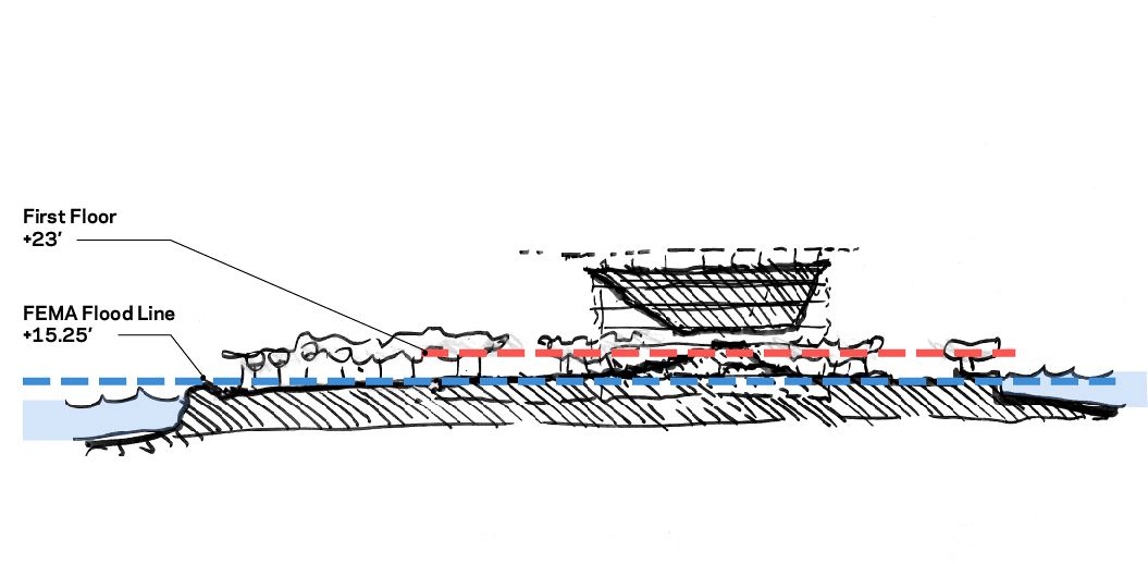 The dramatic cantilevered wings facing northeast and southwest, strategically designed in consideration of rising sea levels and the site's vulnerable position, lift the building off the ground to shelter outdoor spaces.