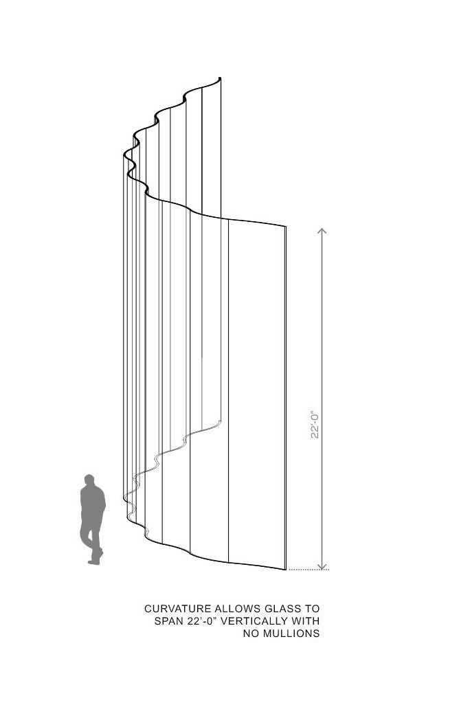 The multipurpose studio loft's elliptical group meeting spaces are centered around skylights at each floor level. The stacked skylights create a continuous line of sight between research spaces below the plaza and the sky above.