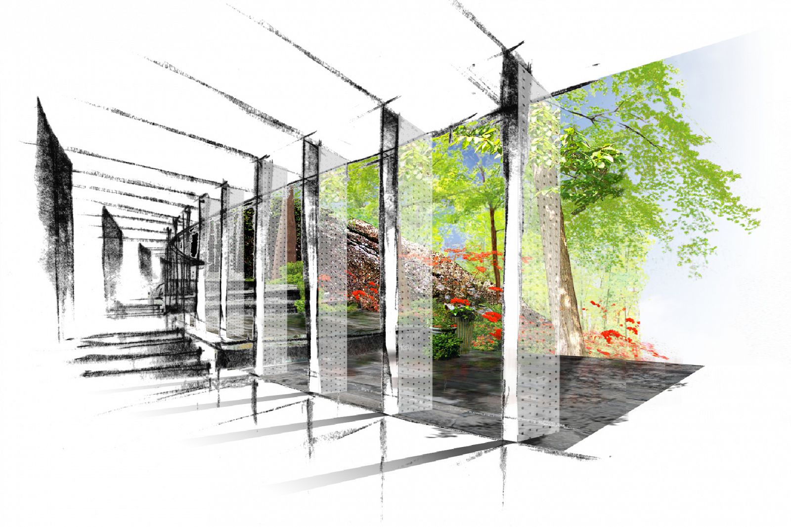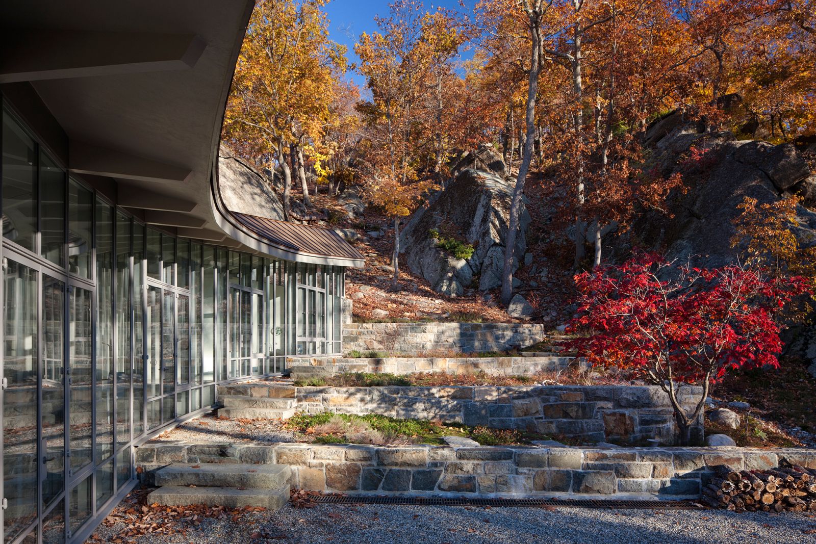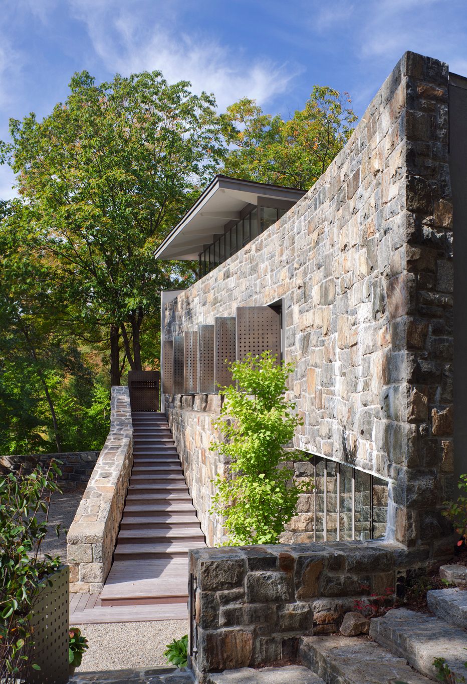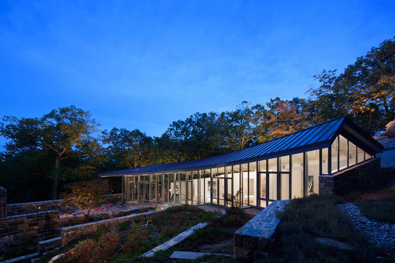 The site is defined by two massive granite escarpments and metered by a series of retaining walls quarried on site that echo the historic stone walls prevalent throughout Tuxedo Park. The design of the house celebrates the extreme topography of the site, which defines its sectional development.