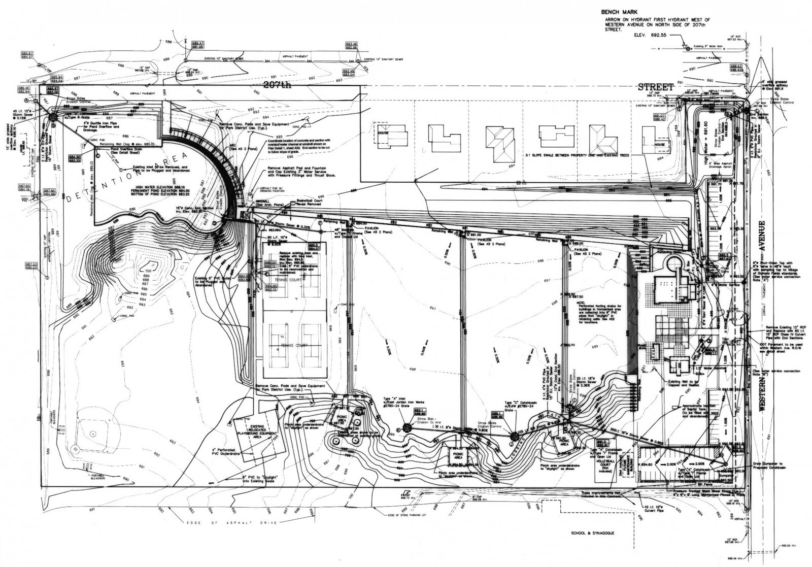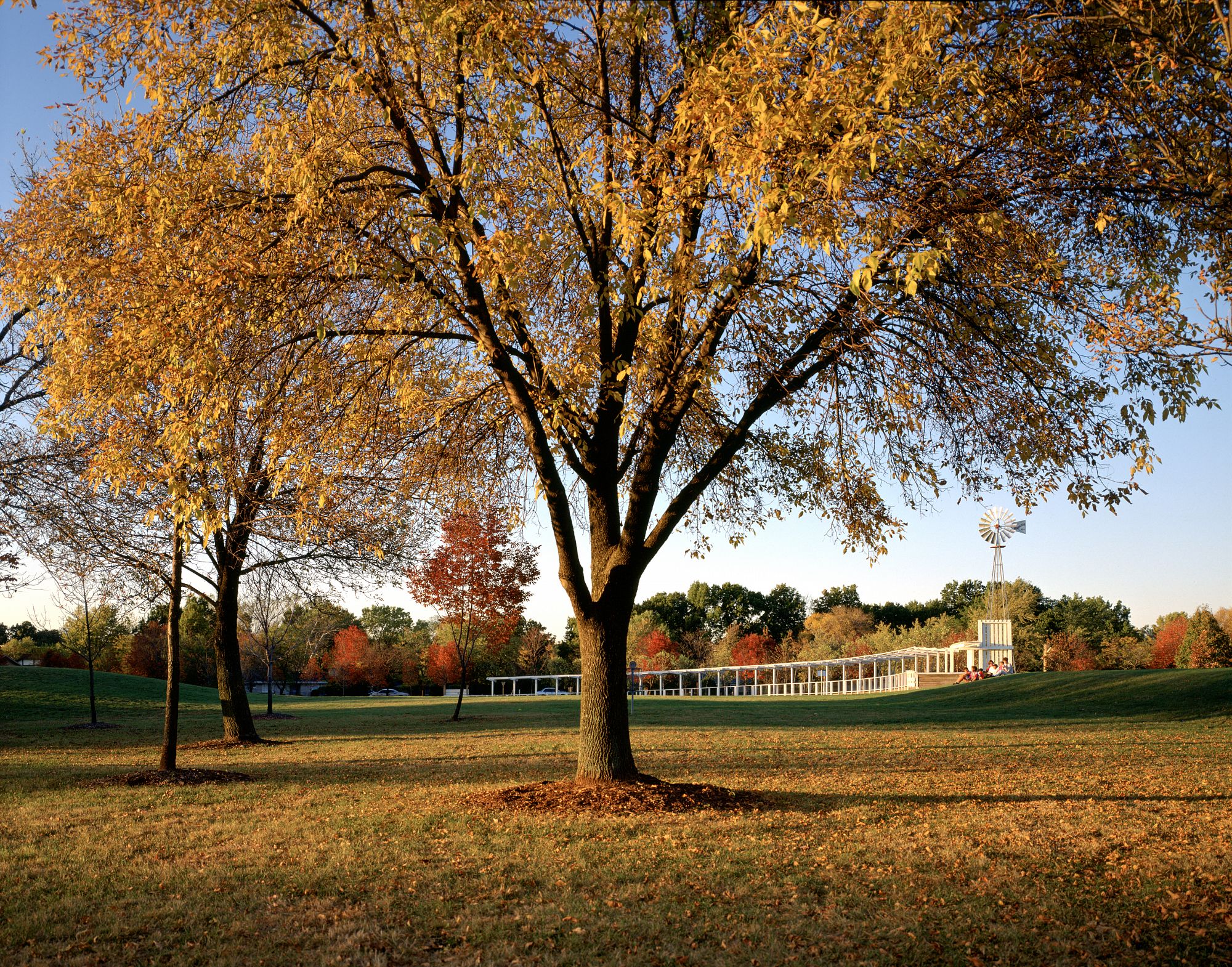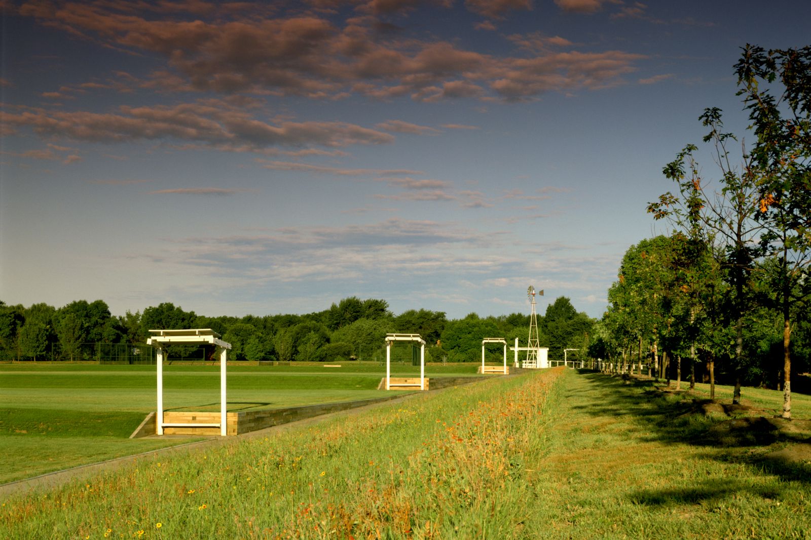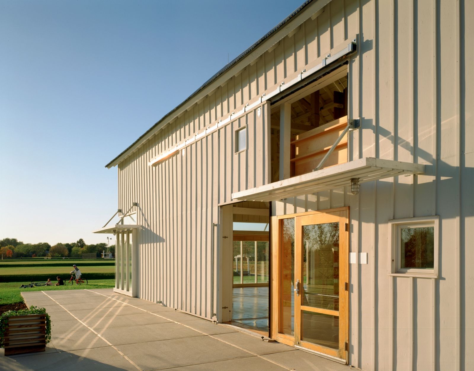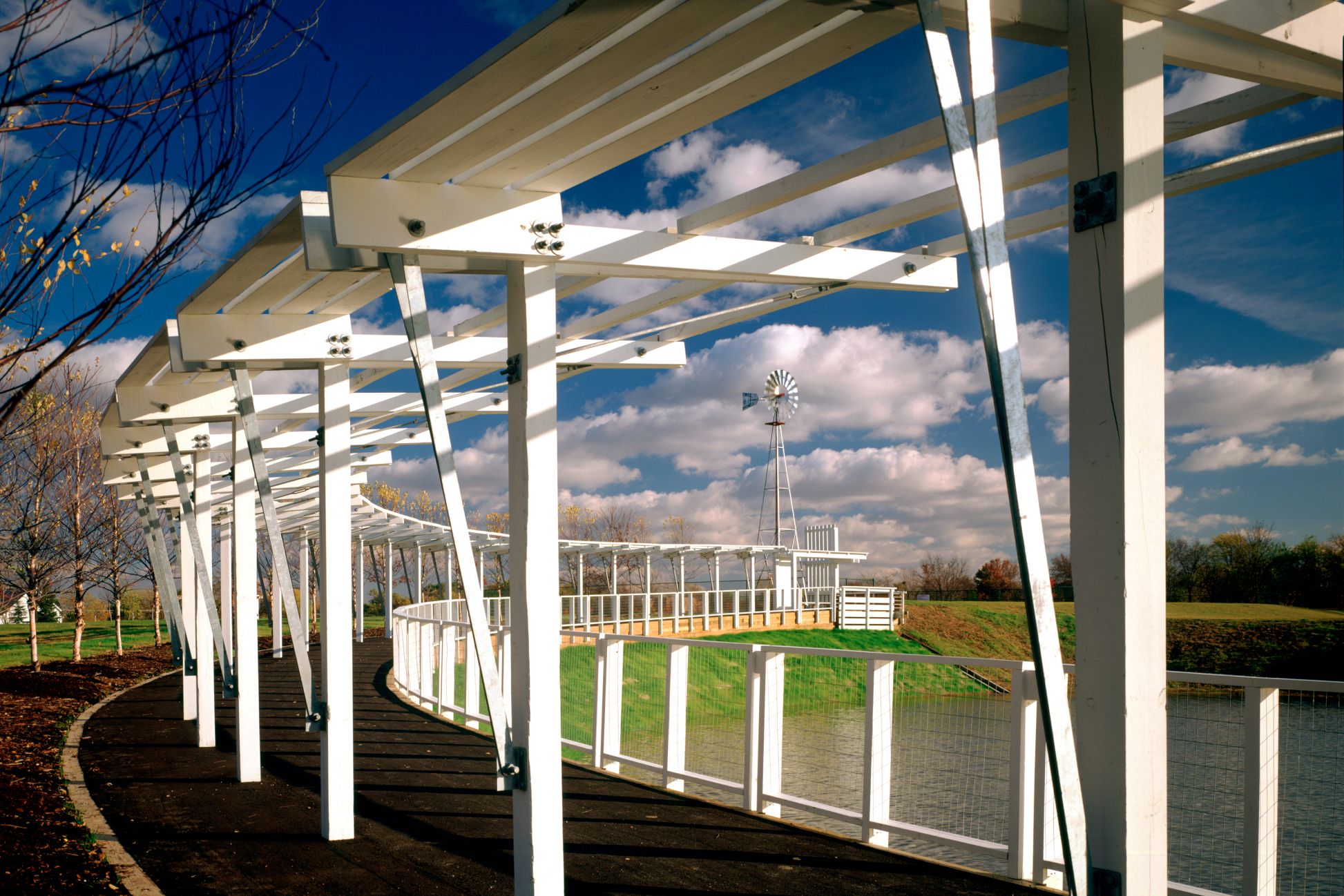 The design for this 20-acre park and community center integrates an existing park, a 10-acre former nursery, and a series of nineteenth-century farm buildings. The new and preexisting structures define a homestead set within the cultivated landscape. Sculpted landforms provide sites for new recreational activities, and accommodate rigorous water detention and retention requirements, and a working windmill that stands as a landmark for the community.