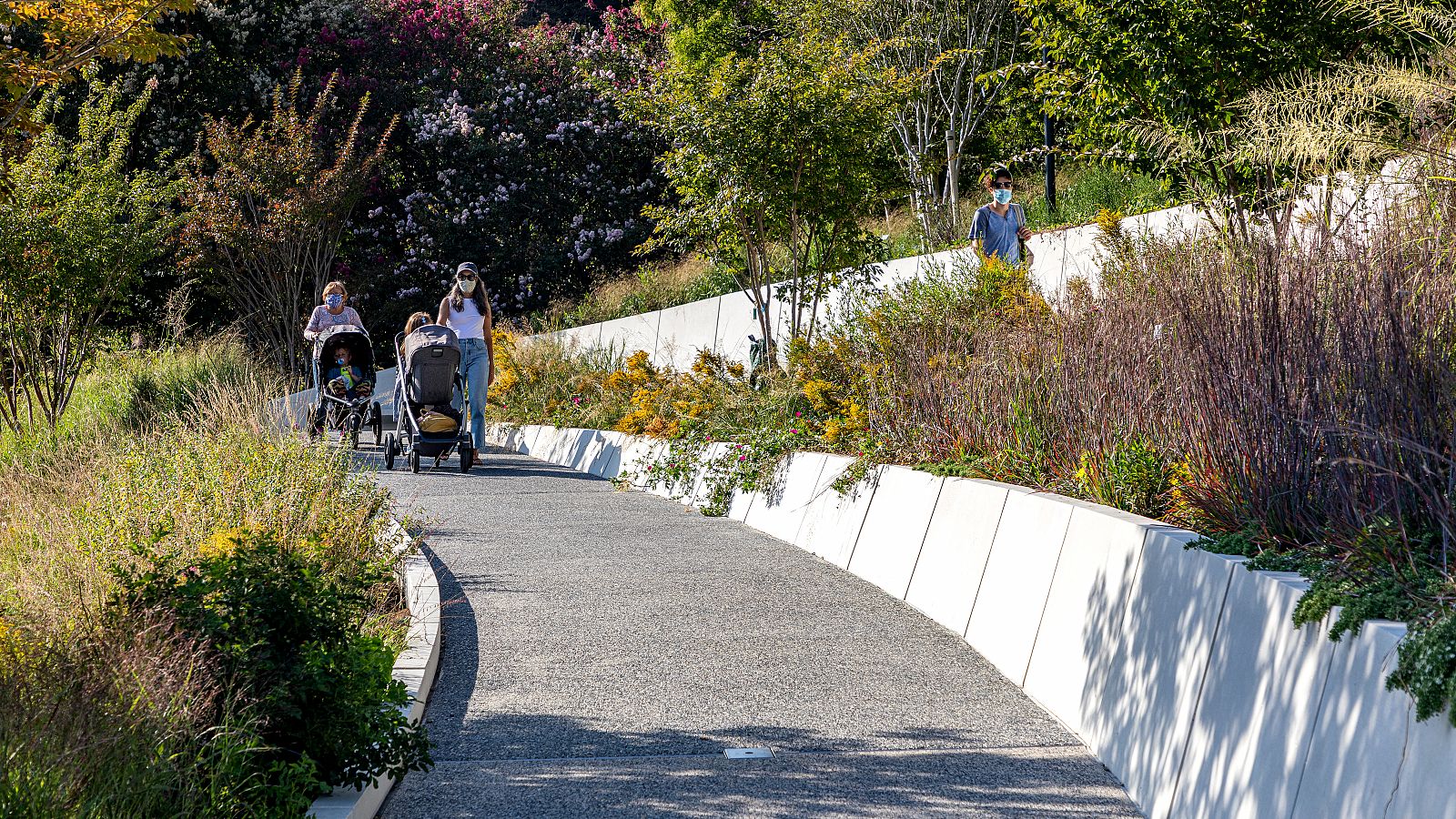 Subtly sloping ramps with sculptural retaining walls enhance the Garden's circulation by connecting the top and bottom of the hillside with a newly accessible route.