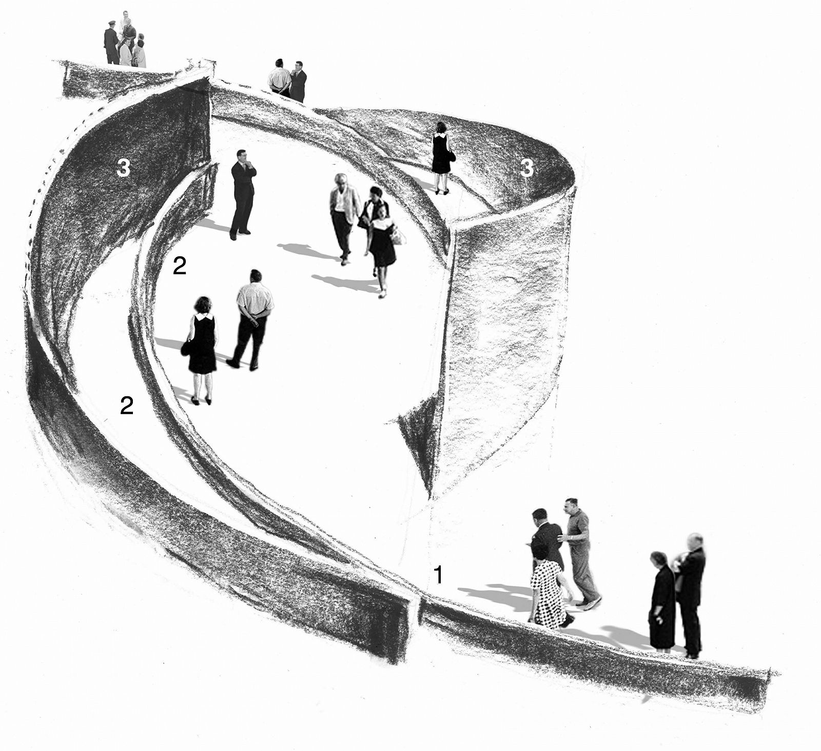 In its curving, open form, shaped by two monumental crescents, the installation creates a space to consider the impact of architecture, landscape, and infrastructure on the choreography of daily life. Through the presentation of models, sectional studies, and films, "Lines of Movement" illuminates the fertile ground in the space between city and garden, art and ecology, and infrastructure and intimacy to create lasting public settings.