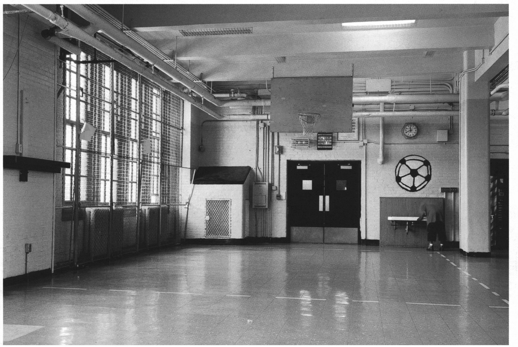 Formerly a gymnasium, the library includes a new perimeter wall that wanders among existing columns, creating study niches, reading alcoves, and maximizing book display.