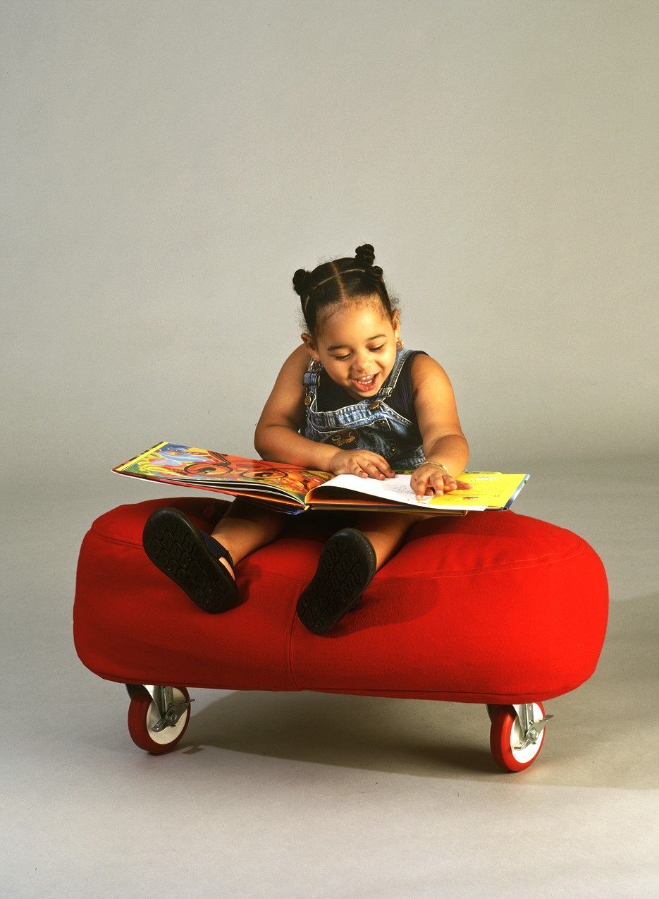 The design envisions the library environment as an interim landscape: a fluid series of adaptable settings. A curvilinear wall thick with books winds through the space. A curtain printed with a large word search can be drawn shut to enclose a smaller storytelling area and rolling bookshelves can stack to one side of the library to creating one large space. Custom-designed rolling ottomans can be arranged in a variety of playful settings.