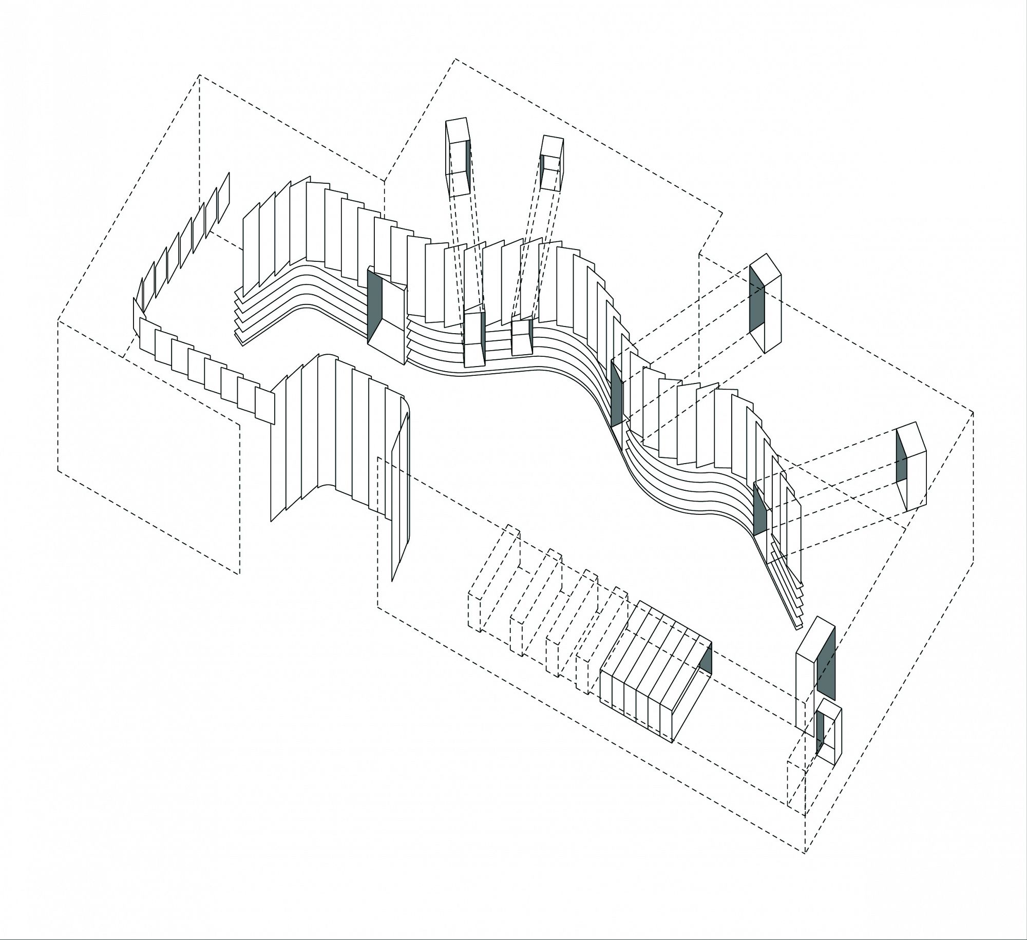 The design envisions the library environment as an interim landscape: a fluid series of adaptable settings.