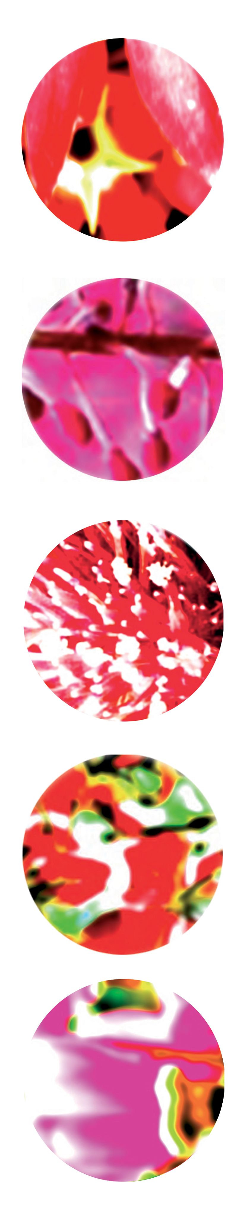 Custom resin tables are cast with magnified and manipulated images from Smith College's botanical collection. Sunlight from the skylight above projects tinted shadows on the concrete floor.