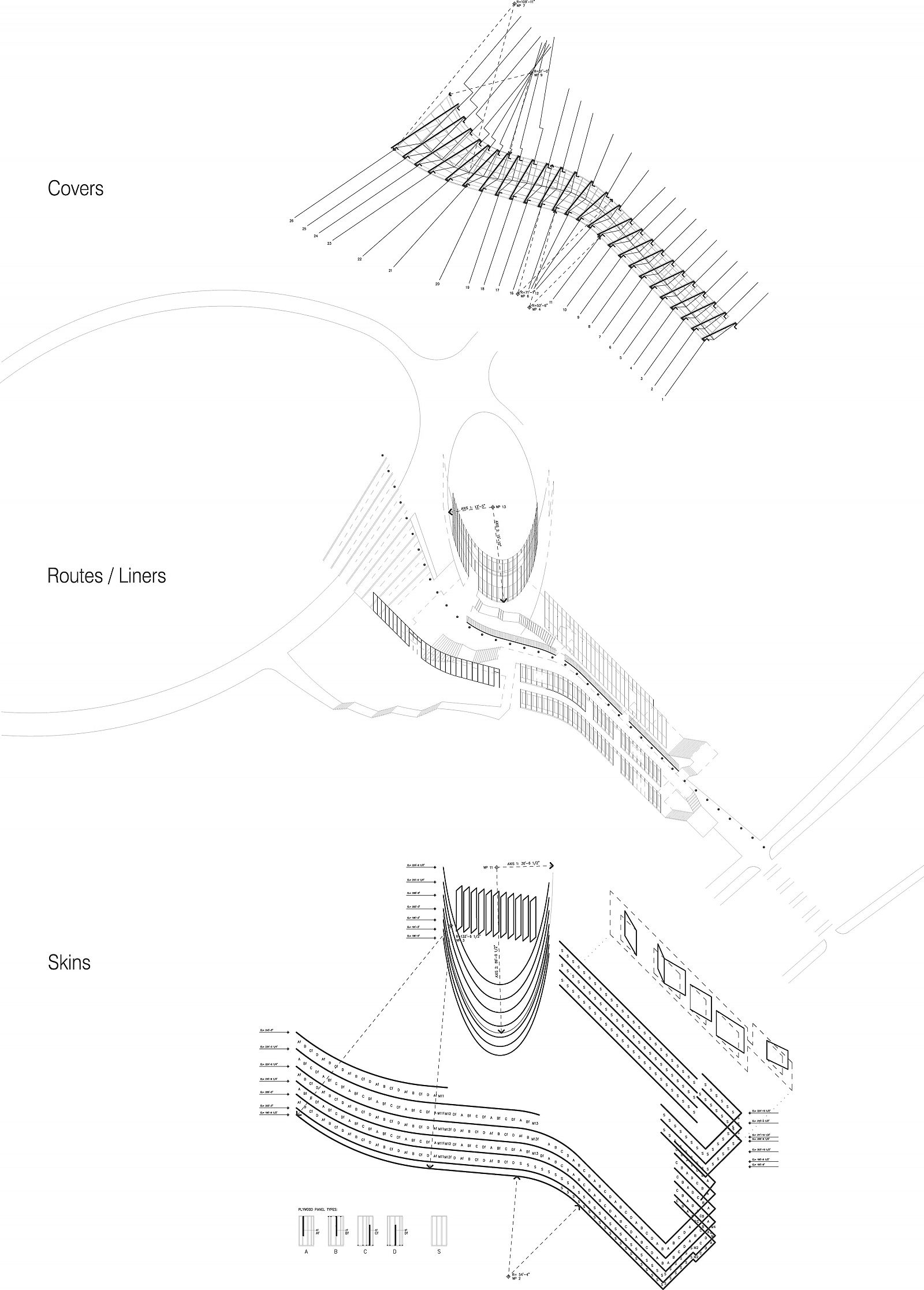 The central route of the building is illuminated by the continuously curving skylight that adjusts in width from twelve feet to thirty-six feet.