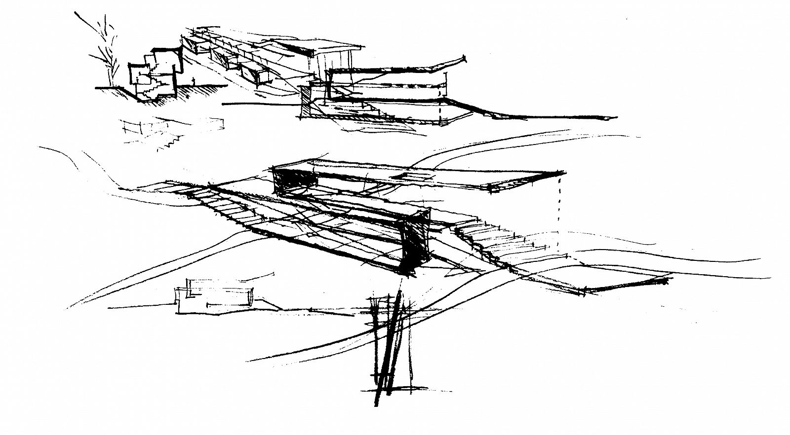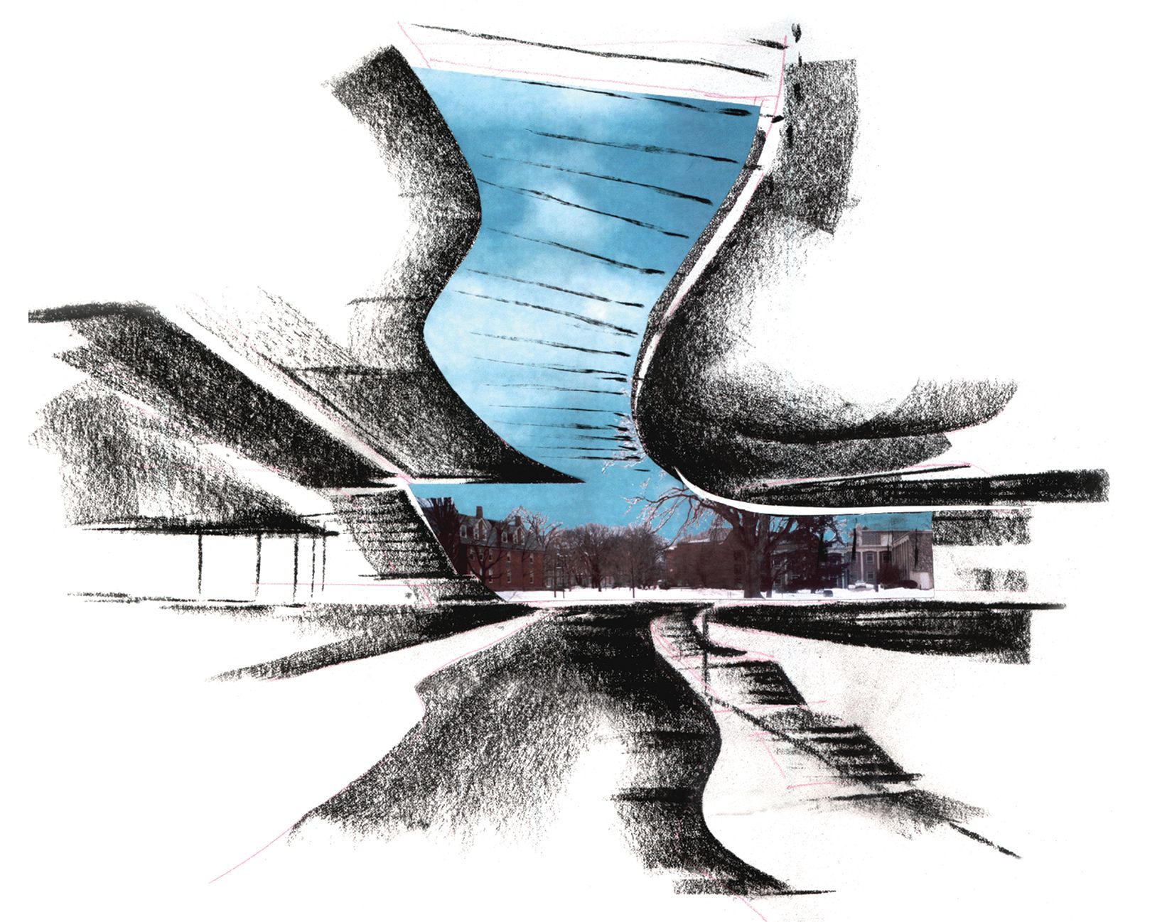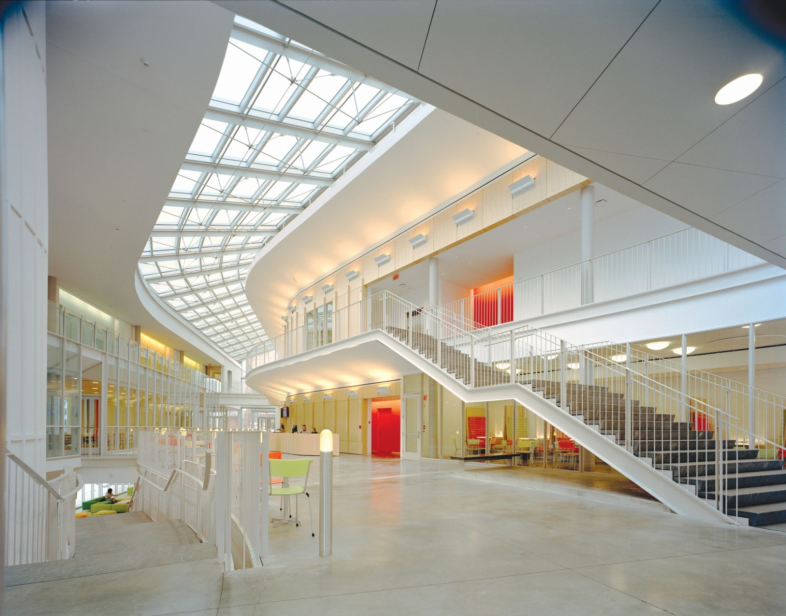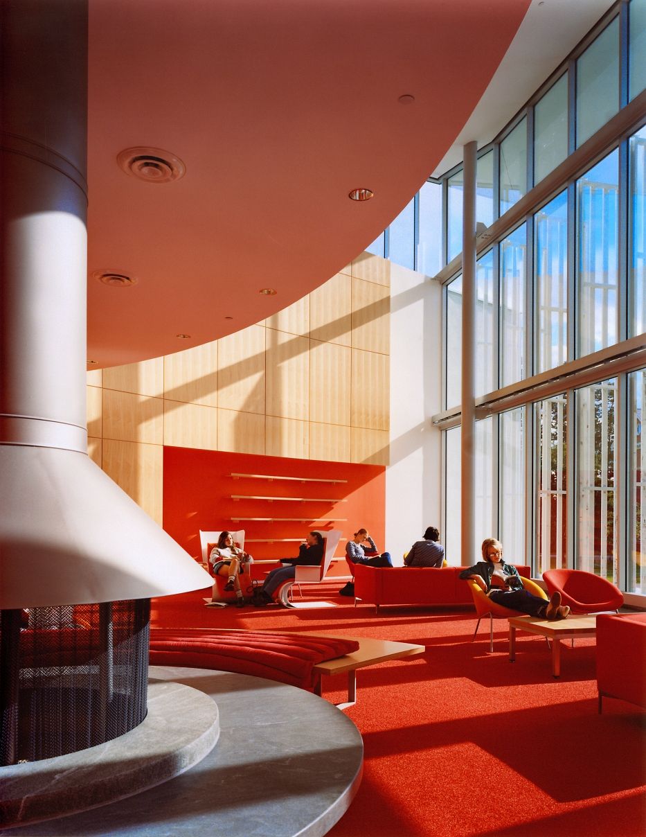 Imagined as an en-route passage through the campus, the building is defined by interconnecting paths that challenge the boundary between inside and outside. These paths converge into a long, curved, skylit gallery that forms the core of the Campus Center. This central corridor is lined with exhibition areas, performance spaces, dining facilities, lounges, mailrooms, and a bookstore. A series of outdoor terraces connect the building's communal areas with the surrounding campus grounds.