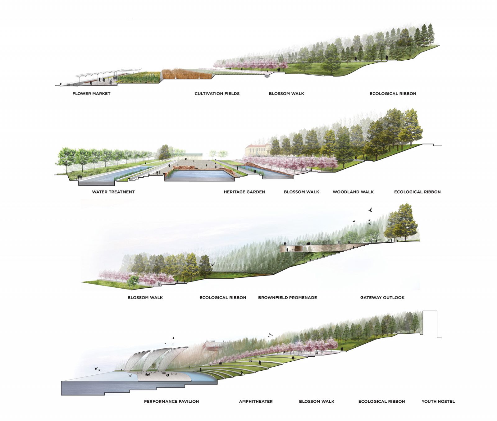 An ecological spine descends from Namsam Mountain and wanders through the park to frame distinct and memorable "Parks within the Park."