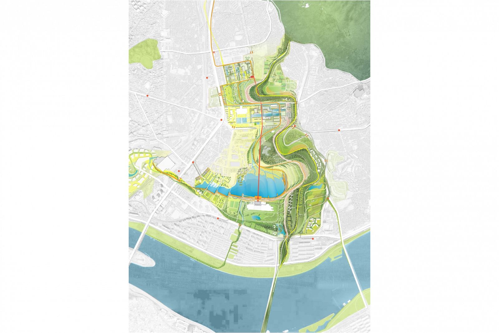 The design shapes one continuous meandering line, an ecological spine, that descends from Namsam Mountain and wanders through the park to frame distinct and memorable "Parks within the Park," reconnecting existing neighborhoods and extending across the Han River. This wandering line, rich with woodland walks and outlooks, combines architecture and landscape to enhance the topography of the site, link multiple programs, and offer dynamic views of the city and mountains beyond.
